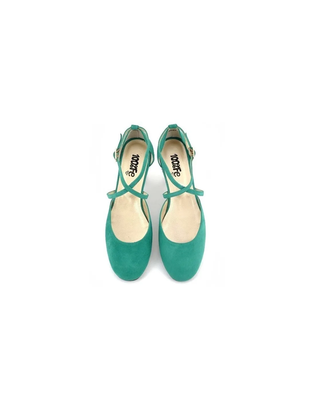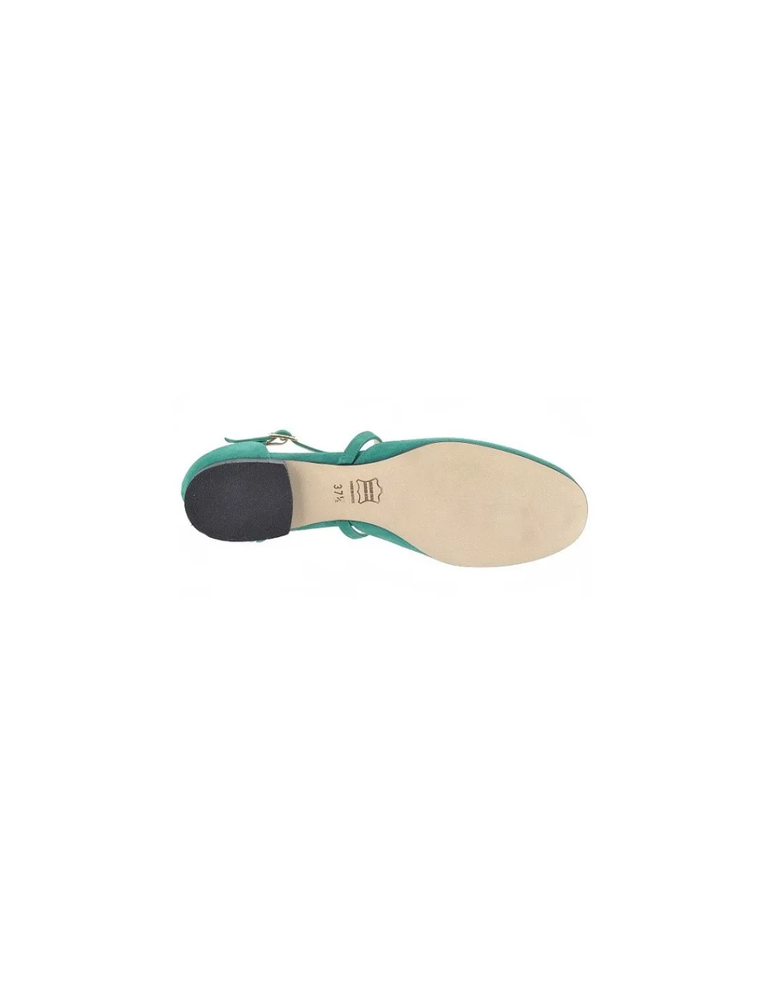 Ten model jest „otwarty” – mogą służyć również jako miejskie sandały. Wykonane zostały z miękkiej skóry zamszowej w kolorze turkusowym. Skrzyżowane na podbiciu, stosunkowo cienkie paseczki tworzą piękny rysunek V bardzo lubiany przez wszystkie kobiety, ponieważ optycznie wydłuża nogi i wysmukla sylwetkę.