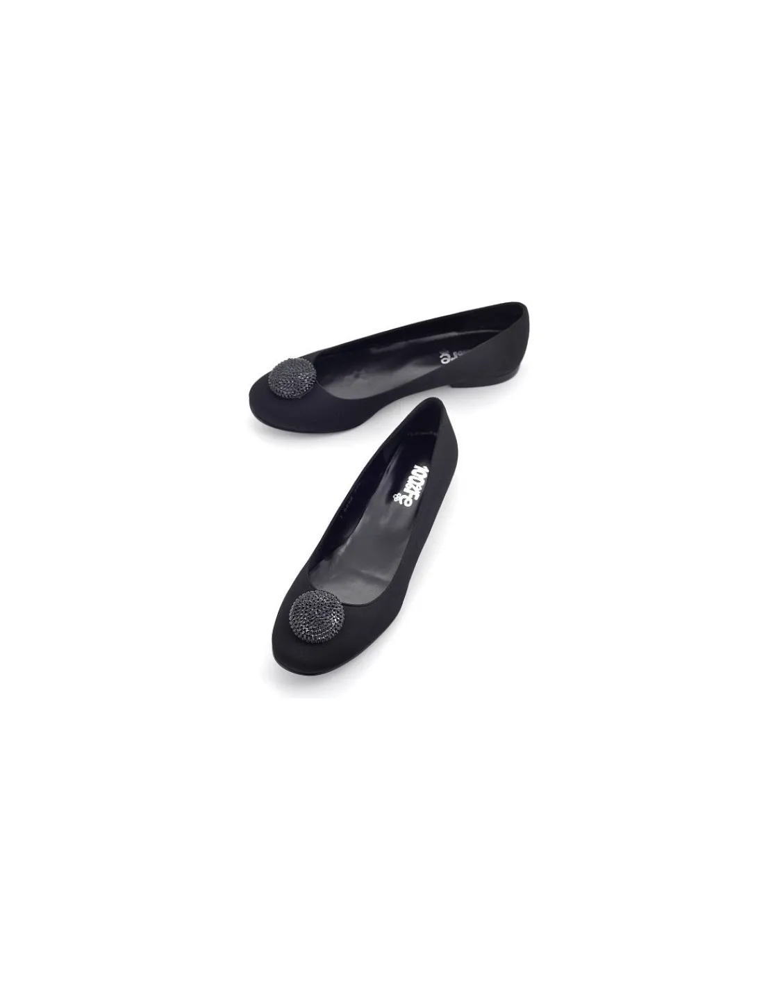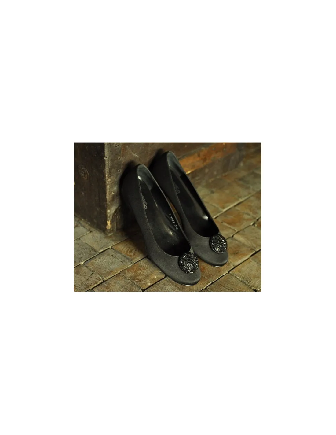 Zostały wykonane z satyny jedwabnej w kolorze czarnym. Jak na satynę przystało, posiada delikatny połysk. Na noskach niezwykle efektowna ozdoba – okrągła rozeta wysadzana kryształami Swarovski w kolorze dopasowanym do odcienia jedwabiu. Dyskretnie połyskuje każdorazowo kiedy tylko pada na nią światło.