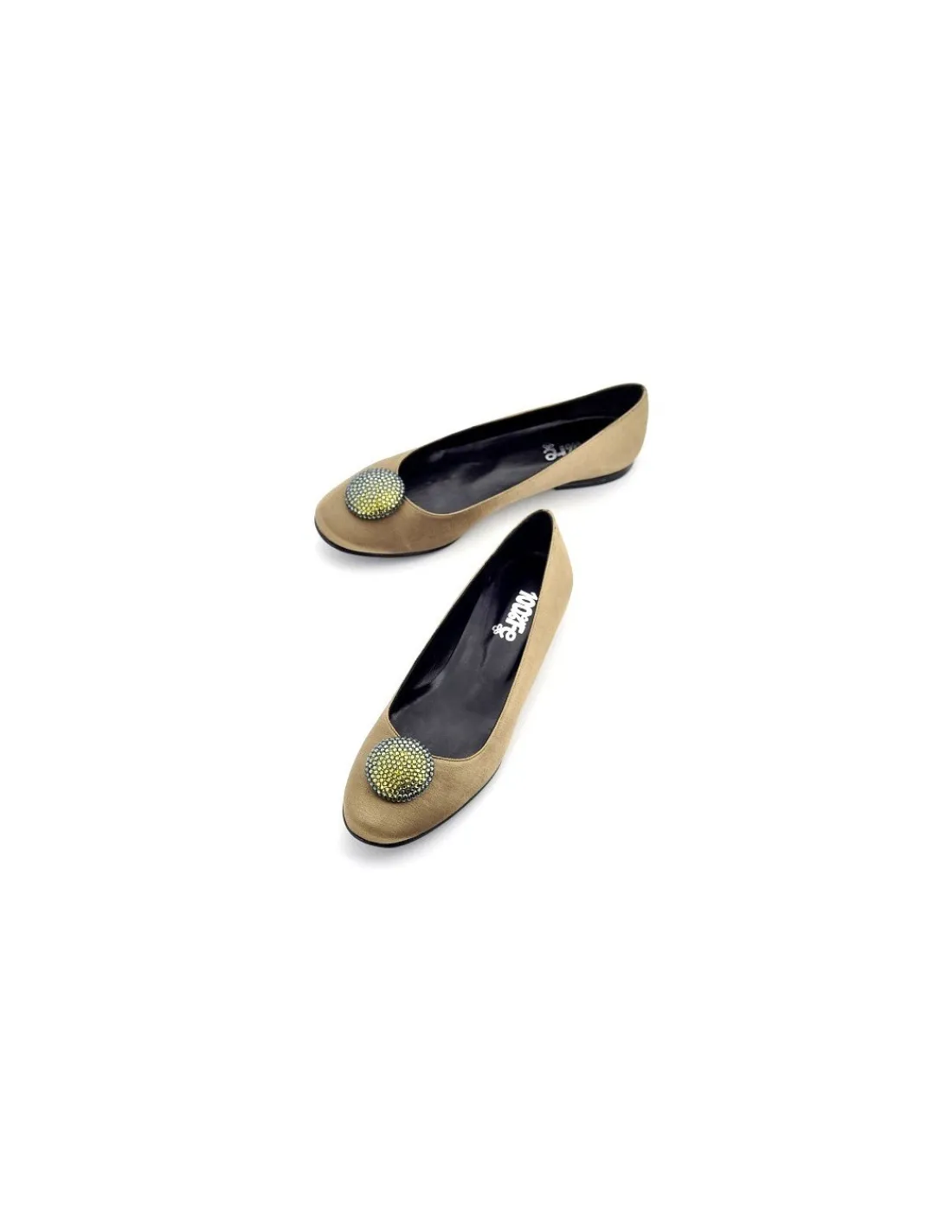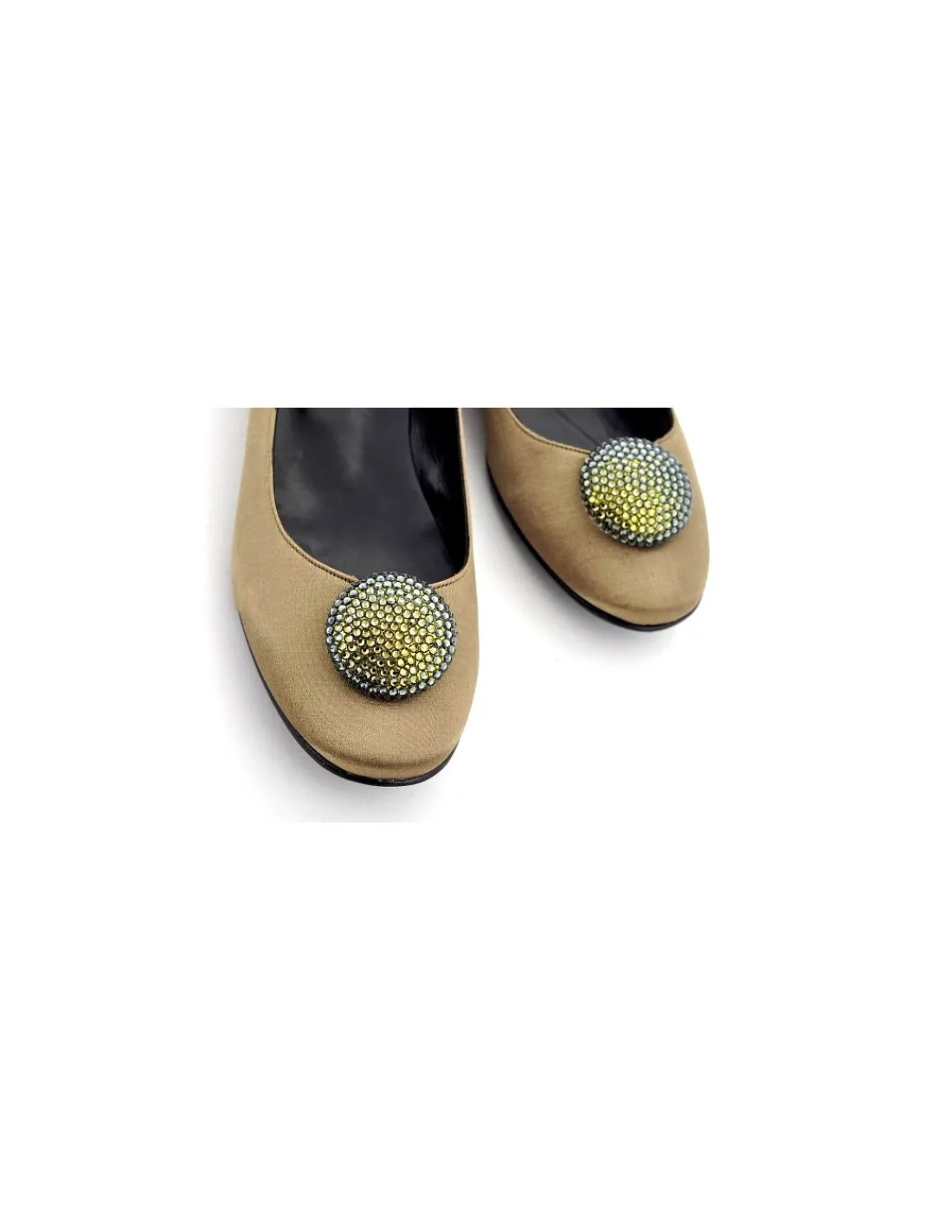 Zostały wykonane z satyny jedwabnej w kolorze starego złota – w zależności od rodzaju światła, może być zbliżony odcieniem do khaki. Jak na satynę przystało, posiada delikatny połysk. Na noskach niezwykle efektowna ozdoba – okrągła rozeta wysadzana kryształami Swarovski w kolorze dopasowanym do odcienia jedwabiu. Dyskretnie połyskuje każdorazowo kiedy tylko pada na nią światło.