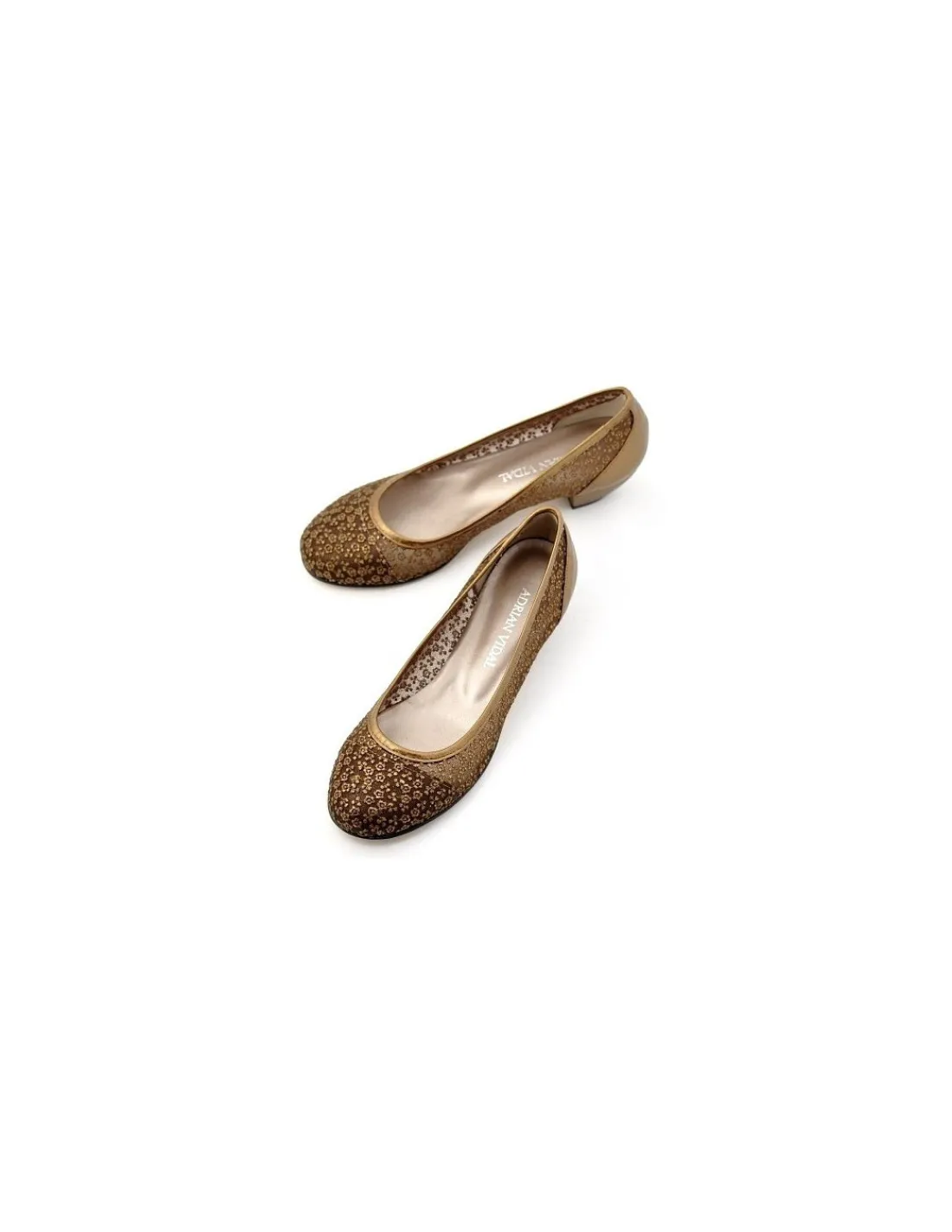Baleriny, które posiadają dodatkowo niewielki obcasik. Efektowne, proste, a jednak wyjątkowe i może nawet trochę romantyczne. Przez nasze Klientki często wybierane jako obuwie okazjonalne. Wykonane są z koronki w kolorze metalicznego brązu / starego złota na której wyhaftowana jest łąka jednolitych w kolorze malutkich kwiatuszków. Nie posiadają futrówki, bo to genialna idea stworzenia sandałów, w których stopa jest zamknięta, a jednak otwarta. Można je traktować jako miejskie sandały. Konstrukcję tej pary baleriny stanowią podnosek i zapiętek. Zapiętek, obcas i wykończenie cholewki wykonano ze skóry licowej w dopasowanym do koronki kolorze złota. Wkładki wykonane są z naturalnej skóry. Logowane skórzane zelówki to absolutnie wyższa półka. Stopy mają lepszą wentylację, „oddychają”, a to zdecydowanie podnosi komfort podczas ich użytkowania. Praktyczne, piękne spełniają marzenia o spektakularnych i komfortowych czółenkach, które prezentują się na stopach bardzo efektownie, odświętnie i być może pokochamy je na całe życie.