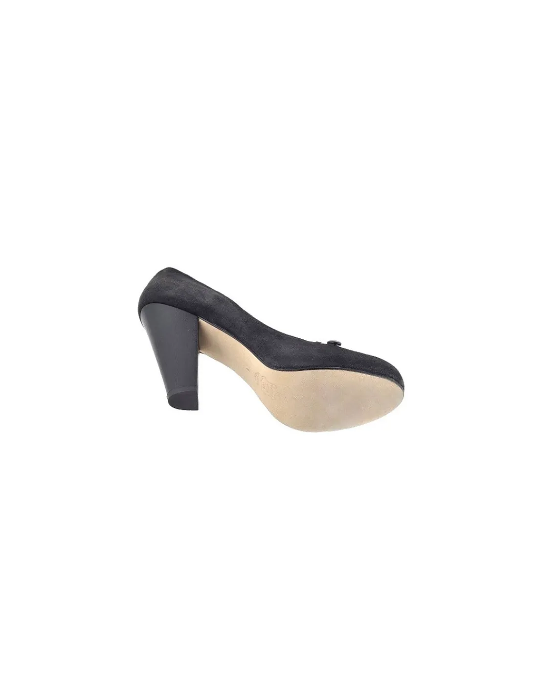 W całości wykonane z antracytowego zamszu i wykończone niewielkimi elementami kontrastującej, acz stonowanej w całościowym efekcie czarnej naturalnej skóry. Forma czółenek okrągła, komfortowa, ergonomiczna, noski podniesione z łatwością mieszczą palce stóp. Wewnątrz wkładki i futrówki z bardzo miękkiej skóry licowej w metalicznym kolorze.