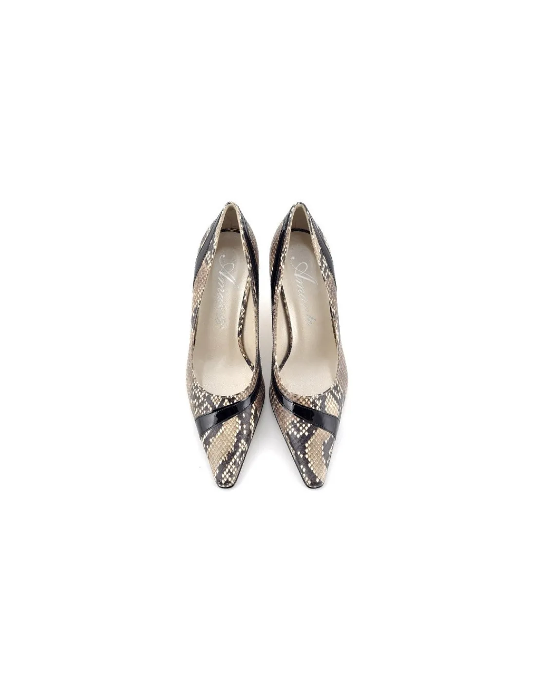 Efektowne czółenka wykonane z doskonałej jakości, skóry licowej, tłoczonej i drukowanej na wzór skóry wężowej. Została ona laserowo ponacinana, aby idealnie odwzorować strukturę wężowych „łusek”. Jest bardzo podatna i miękka, co gwarantuje wyjątkowy komfort użytkowania. Wewnątrz futrówki i wyściółki wykonane ze skóry, a pod wyściółką znajduje się niewidoczna, ale wyczuwalna piankowa wkładka w celu podniesienia komfortu ich użytkowania. Całość przeplata cienkie pasmo czarnej skóry lakierowanej – wijąc się wzdłuż cholewki tworzy niezwykle efektowne wykończenie, podkreślając charakter tego modelu szpilek.