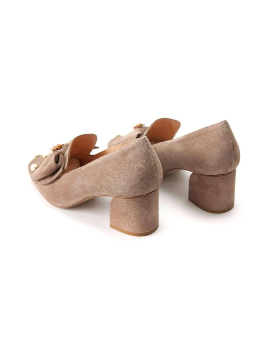 Unikatowe czółenka wykonane ze skóry zamszowej w pięknym szlachetnym kolorze kamiennego beżu, pasującym niemal do wszystkich odcieni świata. Łatwe w dopasowaniu kolorystycznym. Piękna klasyczna forma pozwoli im pozostać w naszej garderobie na wiele sezonów, a charyzmatyczne ozdoby uświetnią nawet bardzo minimalistyczne stylizacje. Absolutnie wyjątkowe buty. Unikatowe , wyprodukowane na nasze zamówienie w bardzo krótkiej serii. Buty dla kobiet pewnych swojej kobiecości i odważnych, nie obawiających się spojrzeń i „podglądania”.