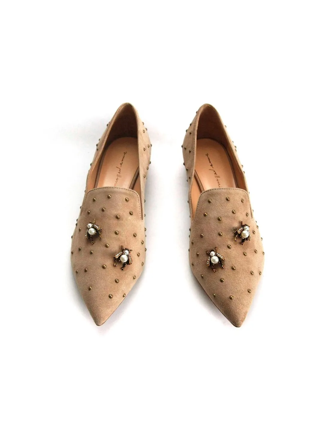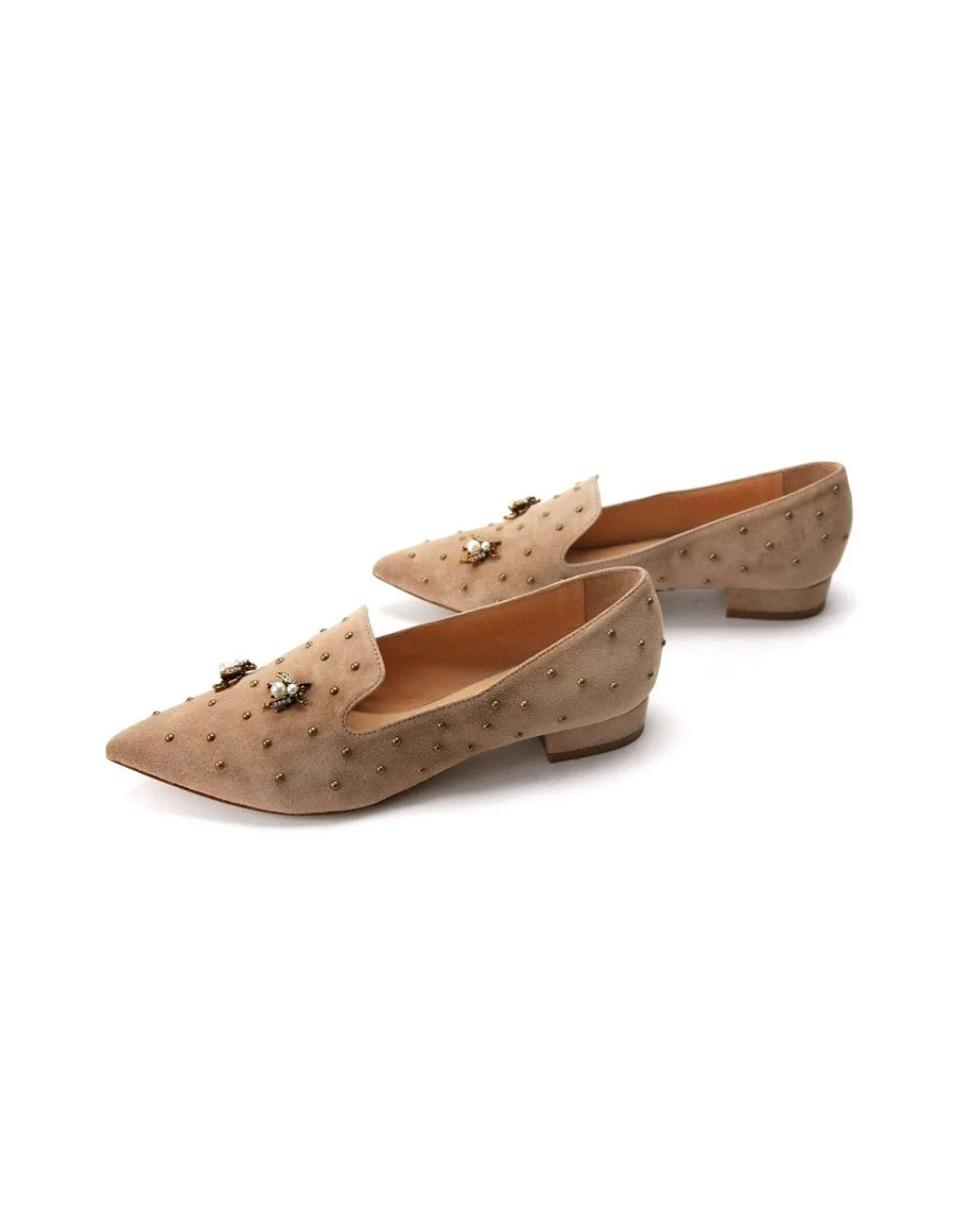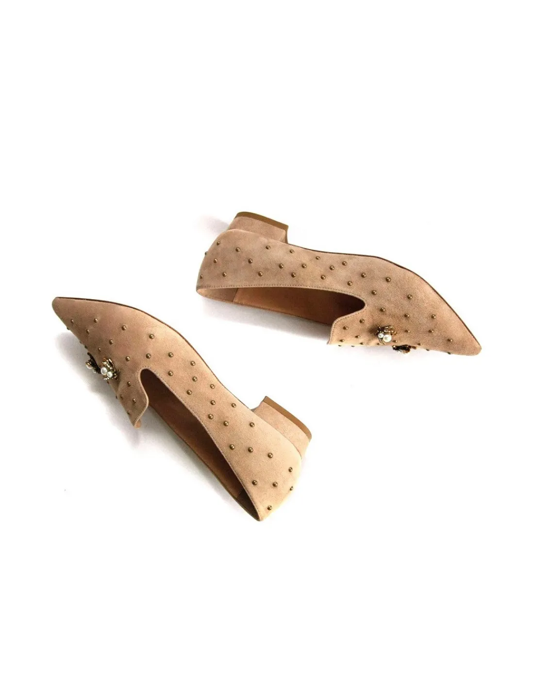 Wykonane z najwyższej jakości, miękkiej, aksamitnej w dotyku, skóry zamszowej w kolorze ciepłego beżu – nude. Na cholewkach osadzono niewielkie złoto -mosiężne knopiki i biżuteryjne muchy z perełkami – szalenie modny dodatek w nadchodzącym sezonie. Wnętrze tej pary czyli zarówno wkładki jak i wyściółki wykonane są z naturalnej miękkiej skóry w jasnym kolorze. Forma nosków zakończona w szpic lecz osadzone na ergonomicznej formie bez ryzyka i dyskomfortu mieszczącej średnią tęgość stóp.
