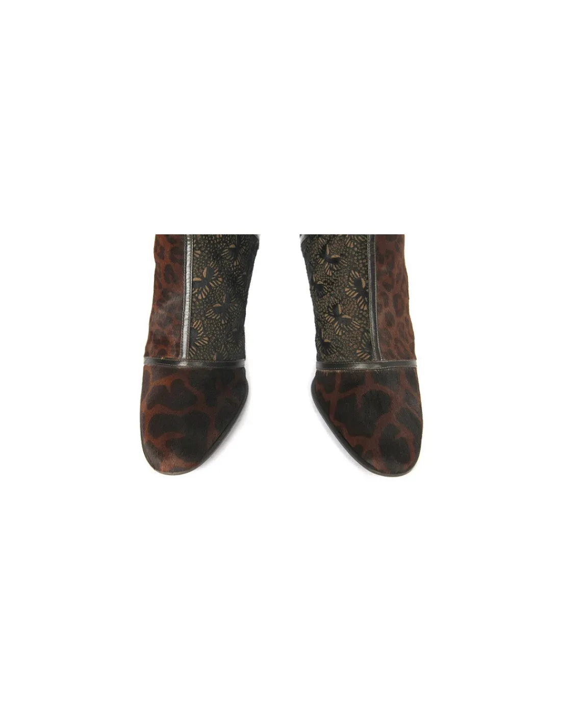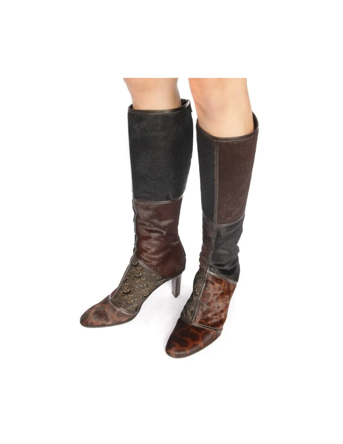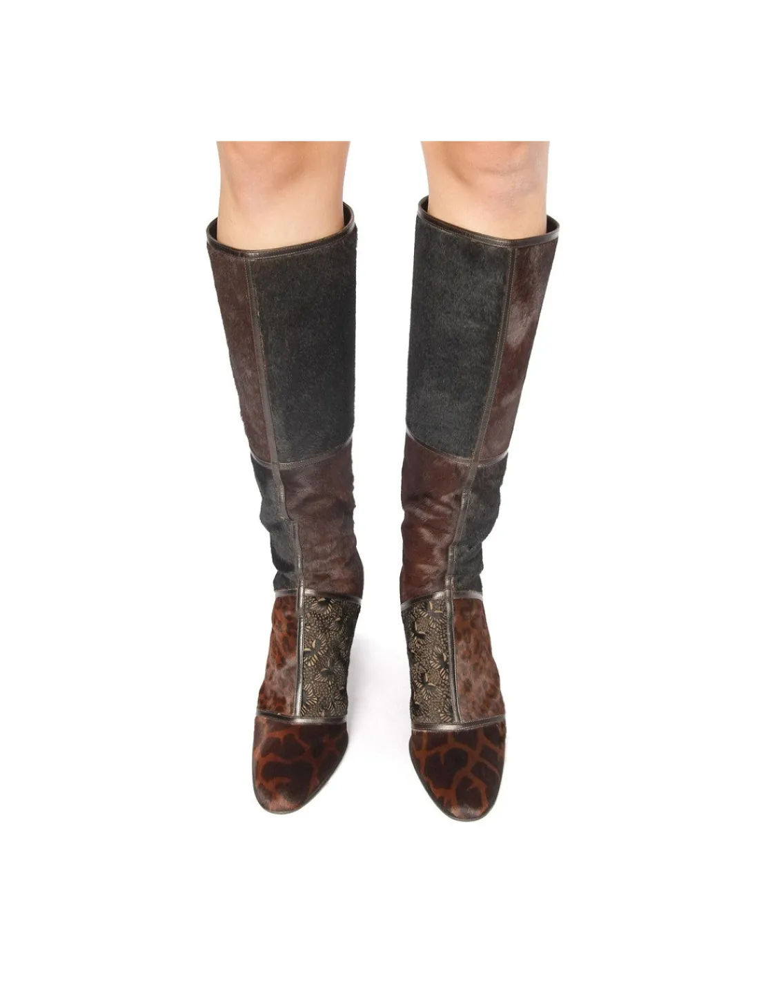 Wykonane z najwyższej jakości, miękkiej skóry bydlęcej z zachowanym włosiem w tonacjach brązowych. Cała powierzchnia kozaków została podzielona na 7 części i każda z nich jest inna. Jedne z nadrukiem zwierzęcych printów , inne z laserowym wycinaniem, a wszystkie rozdzielone cienkimi paseczkami naturalnej skóry licowej również w tonacji brązowej.