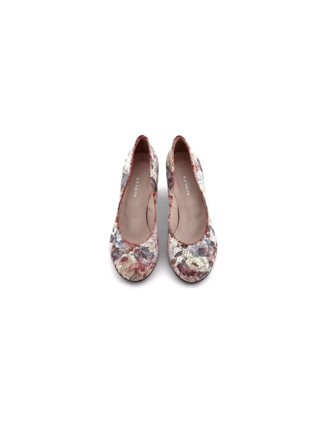 Wyjątkowe, autorskie z efektownym, kwiatowym nadrukiem na skórze vintage. Nie do powtórzenia. Każda para jest nieco inna co wynika ze sposobu wycinania cholewek i nie raportowanym kwiatowym wzorze. Skóra ma charakter vintage – wygląda na popękaną i takie było zamierzenie projektantów, to ukłon w stronę tego trendu. „Pęknięcia” są w kolorze czerwonym, aby były bardziej widoczne. Efekt decoupage przenoszący nas trochę w prowansalski styl. Wnętrze, czyli zarówno wkładki jak i wyściółki wykonane ze skóry cielęcej w naturalnym, pudrowym kolorze. Ten rodzaj skóry jest bardzo miękki. Forma nosków okrągła, dość szeroka.