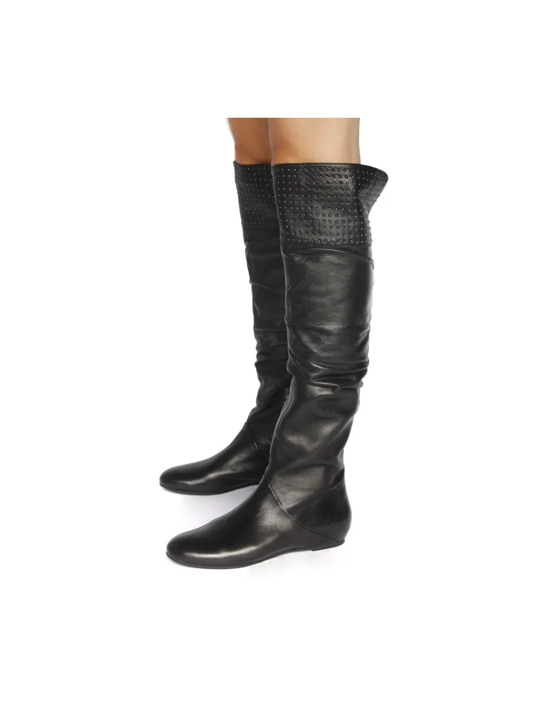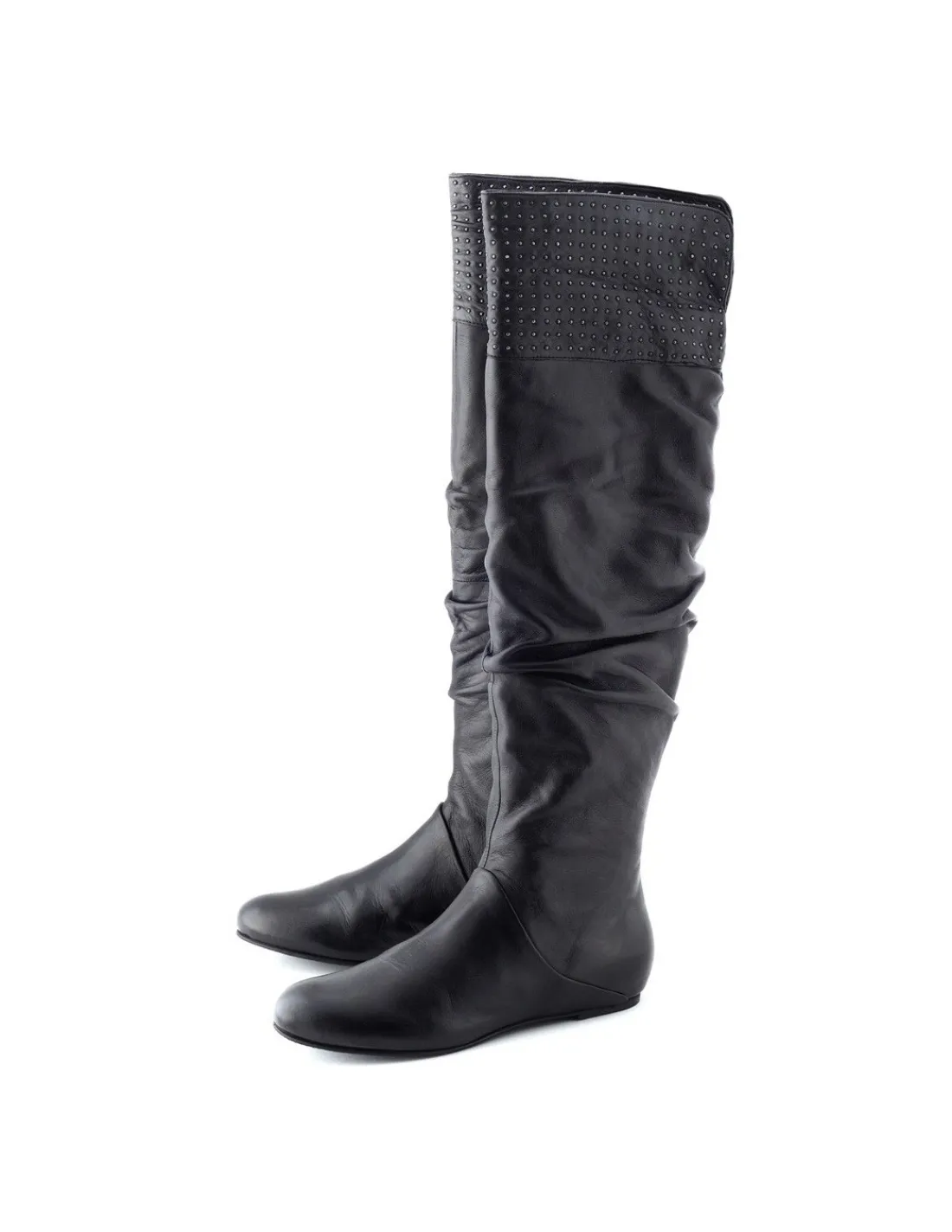 Wykonane z niezwykle miękkiej, mięsistej skóry licowej w kolorze czarnym. Cholewka z lekkim naddatkiem skóry, marszczona luźno. W górnej części cholewki na pasie około 10 cm nabite zostały drobne, delikatne, płaskie nity w odcieniu starego srebra, absolutny must have.