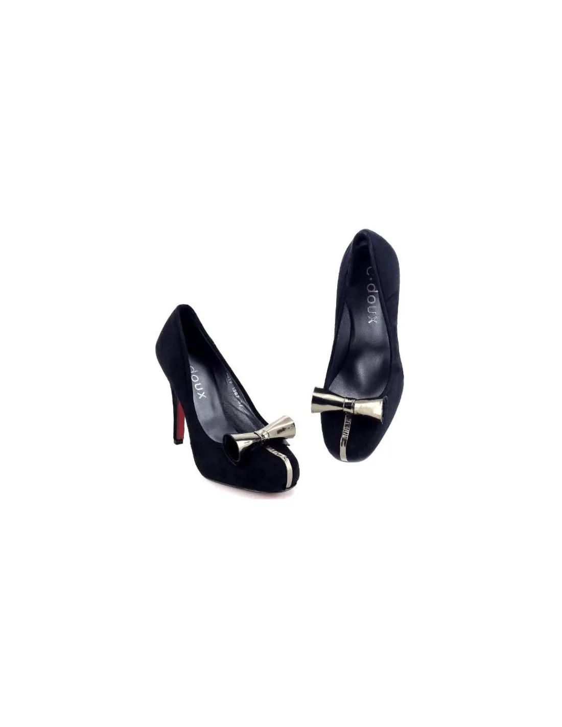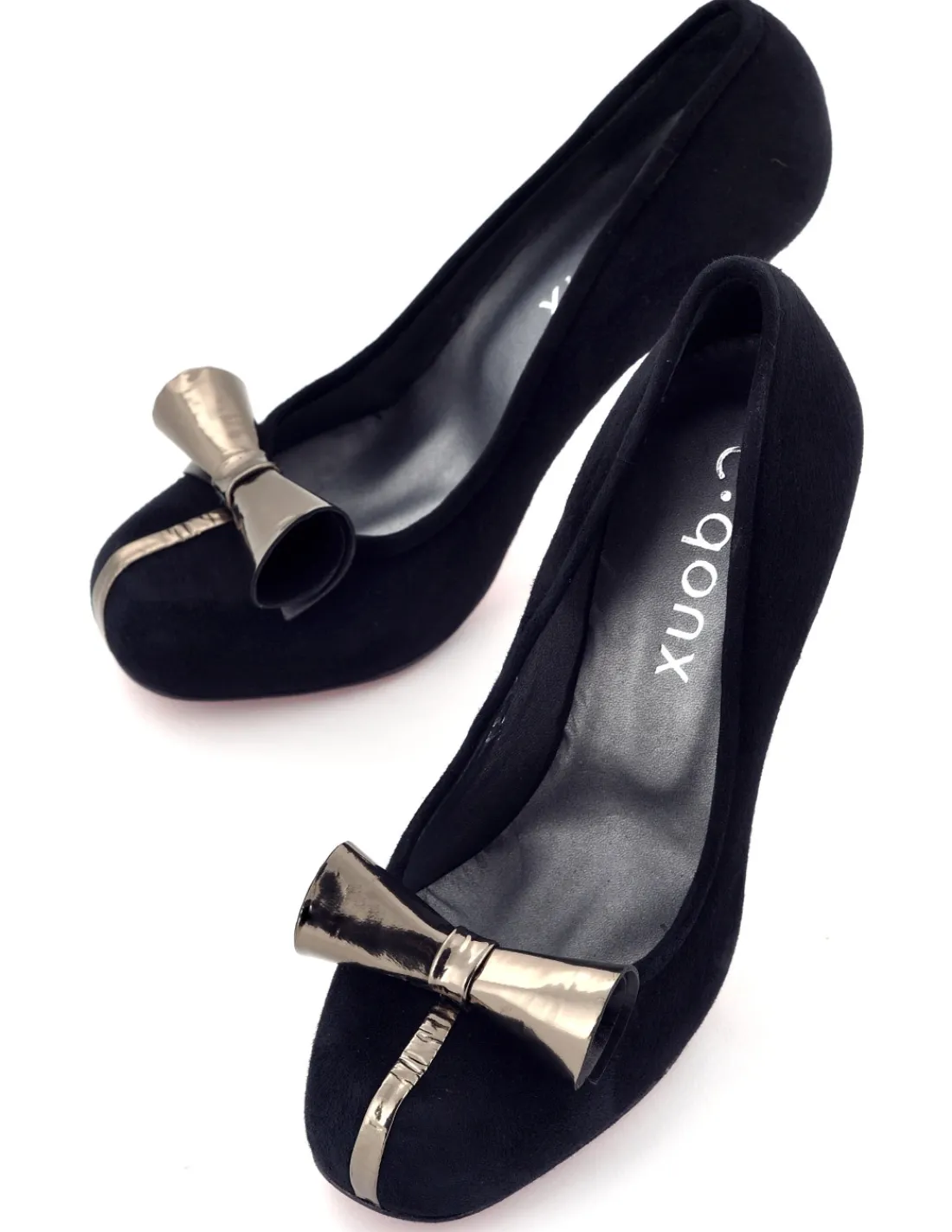 Wykonane zostały z ogromna precyzją, z najwyższej jakości, aksamitnej w dotyku skóry zamszowej w czarnym kolorze. Jakość skóry jest bardzo ważna, ta jest zaskakująco miękka i idealnie dopasowuje się do stóp. Na noskach efektowna ozdoba w postaci dużej, trójwymiarowej kokardy – rulonu wykonanej ze skóry lakierowanej w metalicznym, srebrno – ołowianym kolorze. Wzdłuż nosków także cienkie pasmo tej samej metalicznej skóry optycznie wysmukla nogi. Forma czółenek ergonomiczna,dość szeroka. Noski wysoko podniesione okrągłe. Wewnątrz futrówka i wkładka w całości z miękkiej skóry licowej w metalicznym, ciemnym kolorze.