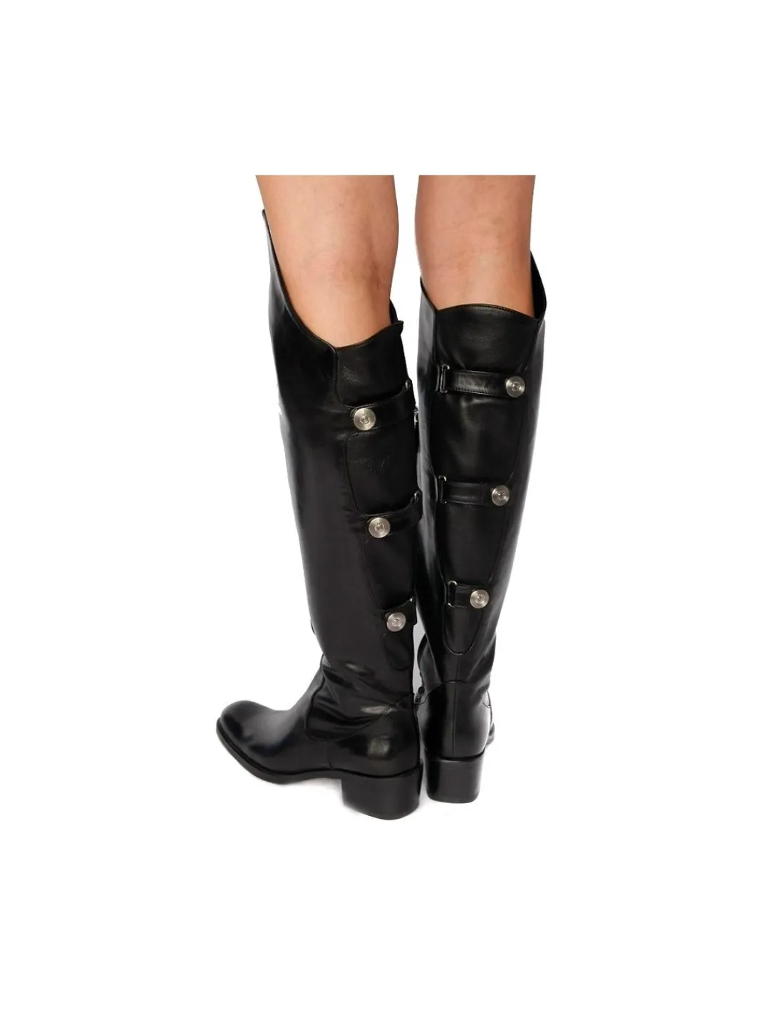 W tylnej części cholewki zastosowano bardzo elastyczną skórę-stretch, dzięki takiemu rozwiązaniu kozaki zgrabnie przylegają do łydek. Niezwykle efektowne, skórzane klamry zapinane na logowany, srebrny zatrzask pełnią rolę ozdobną.