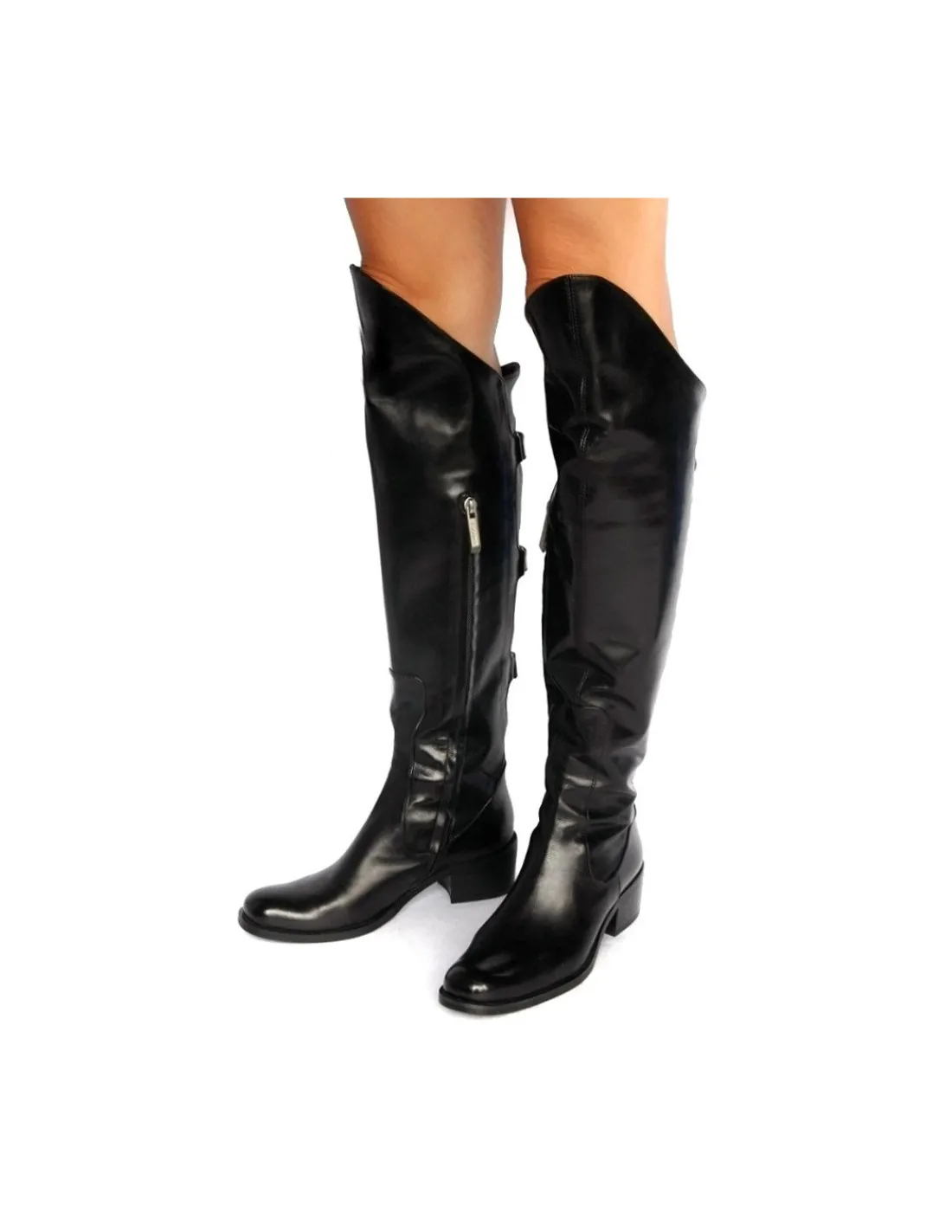 Zapinane na estetycznie ukryty zamek od strony przyśrodkowej. Zamek do wysokości 37 cm. Dalsza część cholewki wychodząca na lub nad kolana, to już wyłącznie kwestia posiadanej długości nóg 🙂 Forma kozaków ergonomiczna, a noski okrągłe, nieco wysmuklone – nazwane migdałowymi.