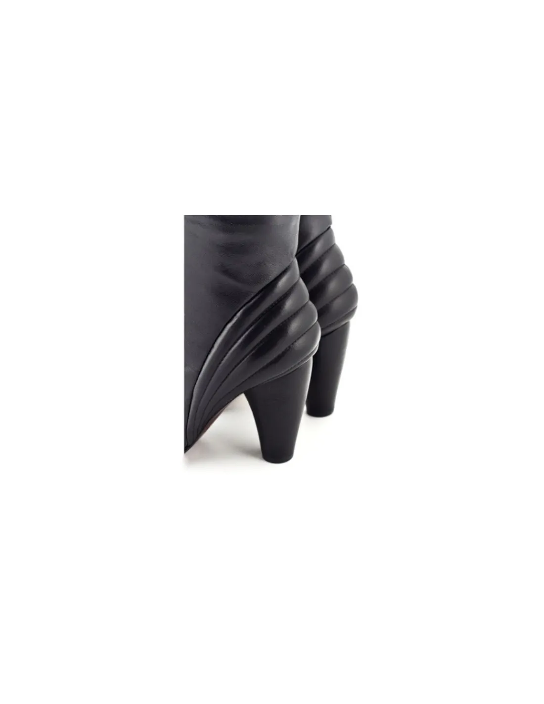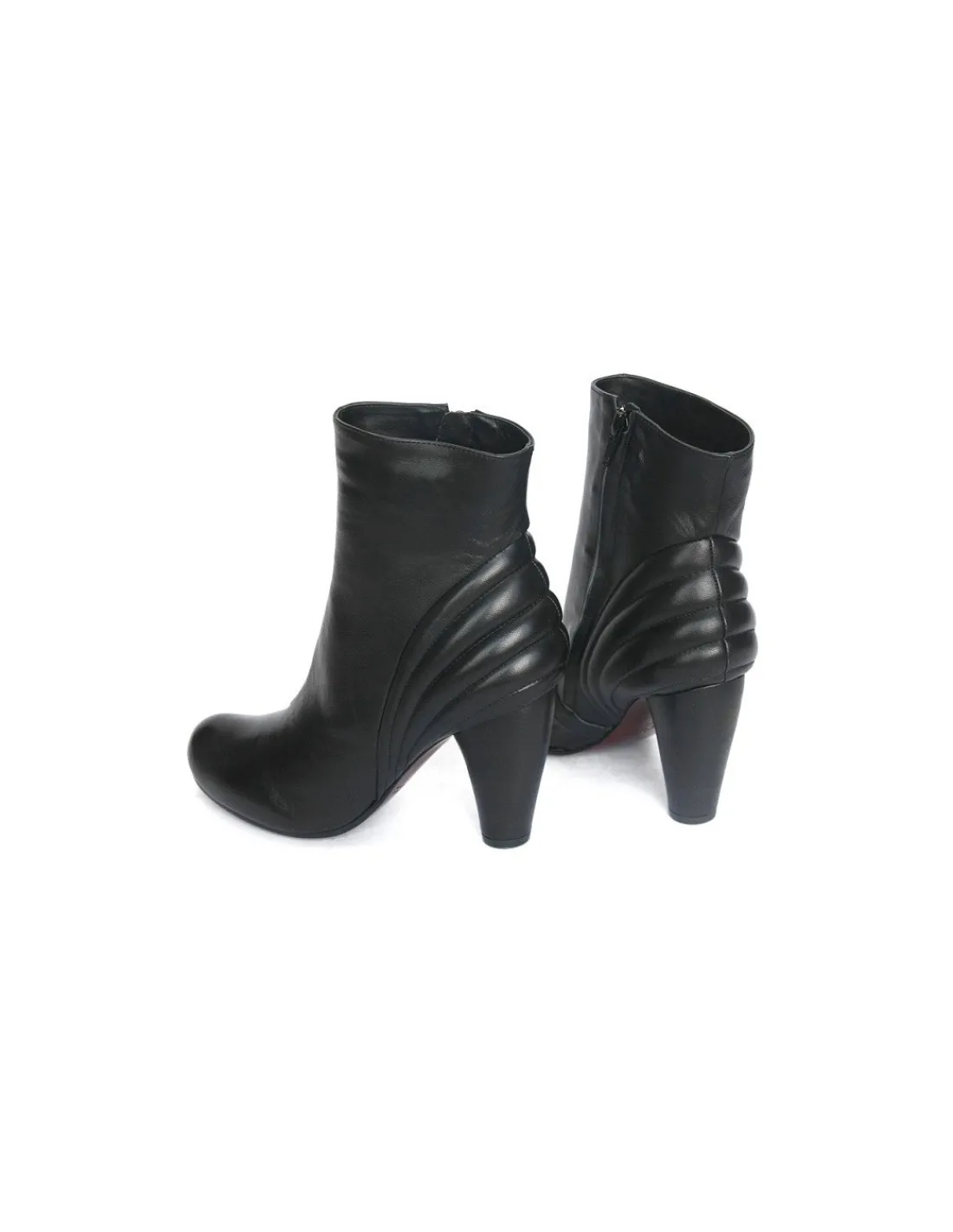 Wykonane zostały z ogromna precyzją, z najwyższej jakości skóry licowej cielęcej w kolorze czarnym. Forma botków ma ergonomiczny kształt, a noski okrągłe nieco podniesione . Wewnątrz zarówno futrówki i wyściółki wykonane są w całości z naturalnej skóry licowej. W tylnej części cholewki wokół pięty efektowne pikowania. Te elementy nie są wykonywane komercyjnie, ale z pietyzmem ginącej już sztuki szewstwa – hand made. Naprawdę UNIKATOWE !