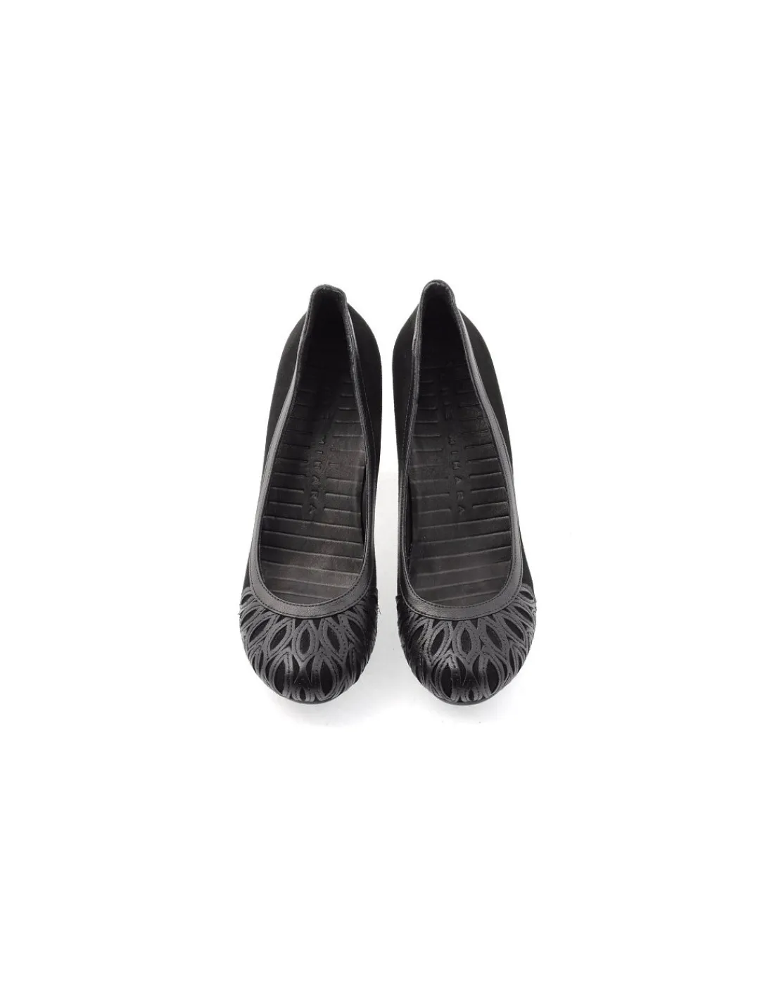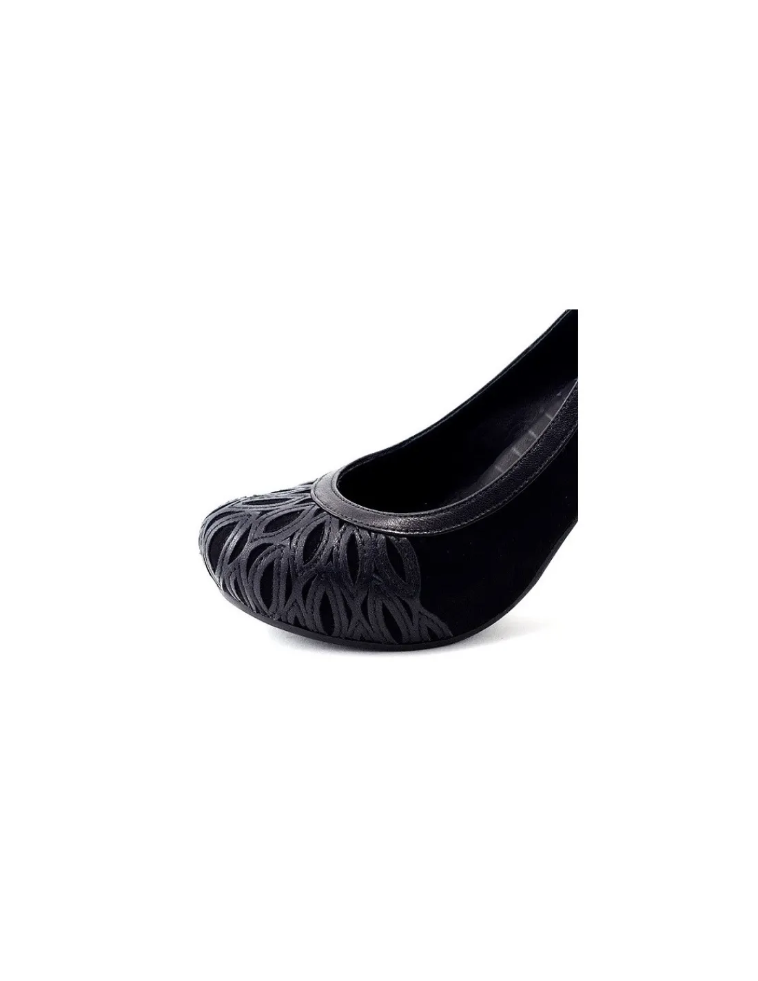 Ten mariaż matowego zamszu z satynowym połyskiem skóry licowej prezentuje się efektownie i szlachetnie. Wykonane zostały z ogromna precyzją z selekcjonowanych skór. Rolę główną zagrała tu czarna , zamszowa skóra pospołu z naturalną licową, z której wykonano delikatną wręcz koronkową aplikację. To właśnie noski czółenek zdobi niezwykle atrakcyjna aplikacja ze skóry licowej. Naszyta jest na noski butów z zachowaniem ręcznej pracy rzemieślników. Zyskano dzięki temu niespotykany efekt skórzanej, koronkowej aplikacji, a różnica w materiałach – matowy zamsz i odbijająca światło skóra licowa świetnie ją podkreśla.