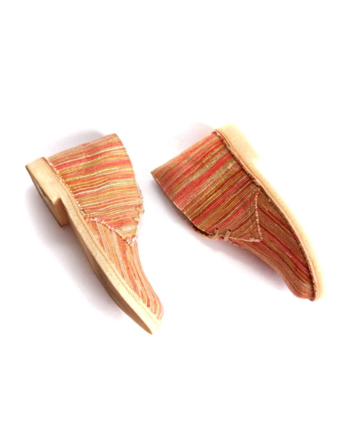 Wygodne i bardzo praktyczne buty, są obecnie kultowym modelem marki. Ten model wykonano z specjalnego materiału utkanego na zlecenie dla Original’s z cienkich, kolorowych paseczków. Wkładki skórzane, futrówki z tkaniny bawełnianej. Buty sznurowane na dwie dziurki – dość wysoko, sznurowadłem bawełnianym w beżowym kolorze.