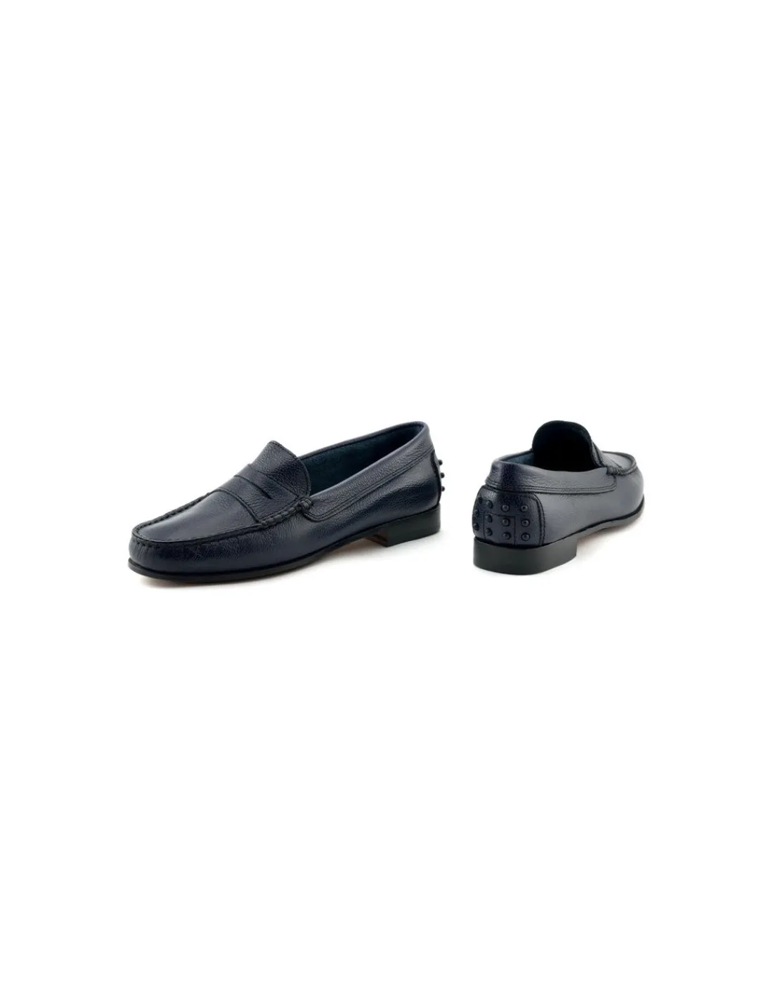 Wykonane są z jednego kawałka naturalnej, strukturalnej skóry bydlęcej w kolorze granatowym. Jest to skóra groszkowa i ma charakterystyczne, malutkie, chropowate kropeczki. Podeszwa i boki mokasynów stanowią całość, dopiero później doszywana jest górna część cholewki i skórzane zelówki typu car shoes. Szwy poprowadzone są na zewnątrz, dzięki czemu model ten jest bajecznie komfortowy. Te mokasyny nie posiadają futrówek, wierzchnia część cholewki jest pojedynczą skórą, a wnętrze to jej lewa strona. Takie rozwiązanie sprawia, że o wiele lepiej się dopasowują. Są miękkie i lekkie. Wyściółki skórzane.