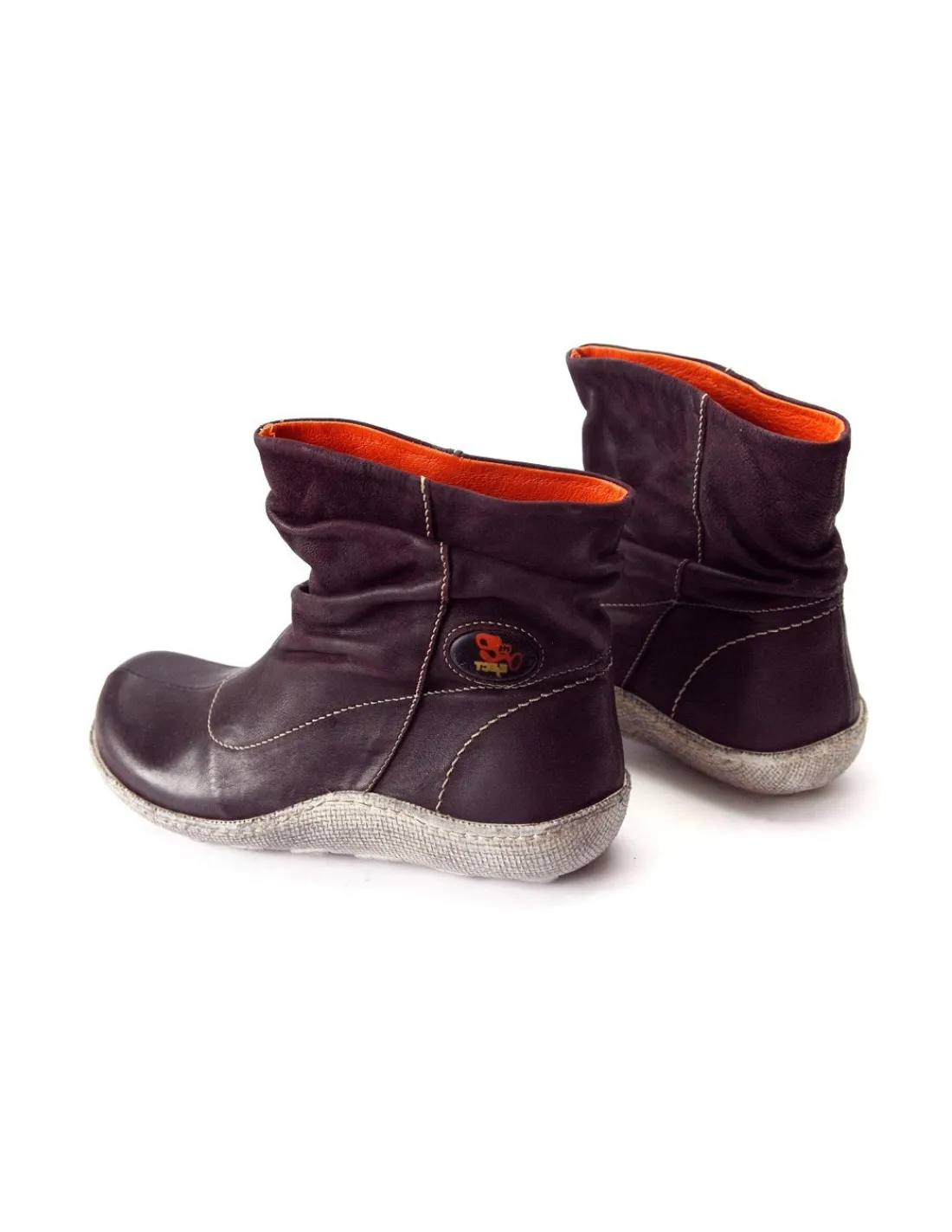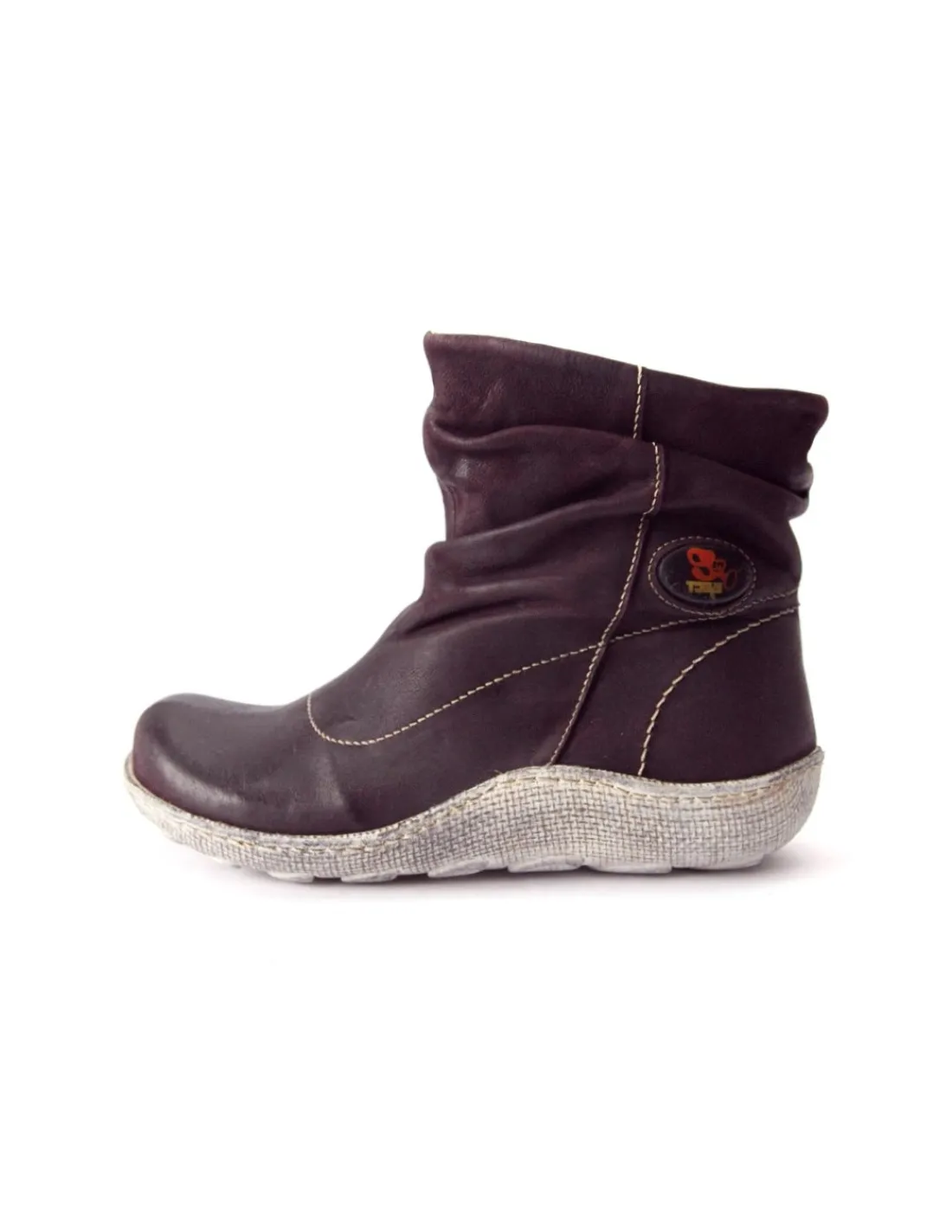 Botki wykonane z najwyższej jakości skóry nubukowej w głębokim kolorze bakłażana. Skóra jest postarzana z efektem vintage, w górnej części cholewki nieco marszczona. Wciągane w oka mgnieniu i bez zamka, krótkie nieco powyżej kostek. Interesującym elementem są efektowne, długie, logowane getry, które zupełnie zmieniają wygląd oraz funkcję tych botków.