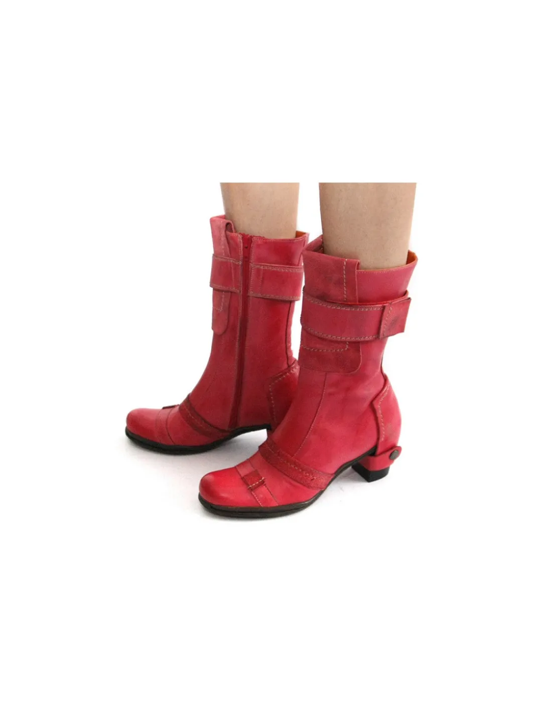 Te unikatowe, stylowe botki (lub jak ktoś woli kozaki 3/4) wykonano z połączenia skóry licowej z zamszowymi wstawkami, a wszystko to w głębokim kolorze koralowym, malinowym. Dla osiągnięcia efektu vintage skóry delikatnie patynowano. Zdecydowanie polecamy osobom ceniącym niepowtarzalny, oryginalny styl w modzie. Wyjątkowe w krótkiej, limitowanej serii. Bo przecież jesień i zima nie muszą być szare. Więc kto tęskni za kolorem, proszę bardzo!
