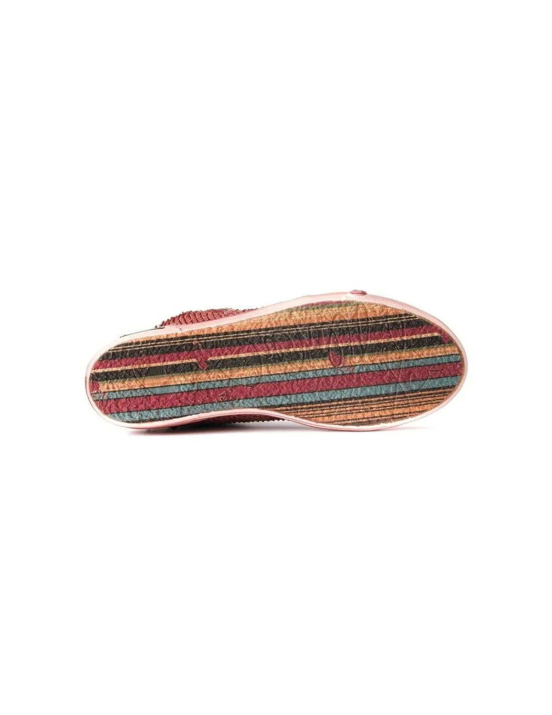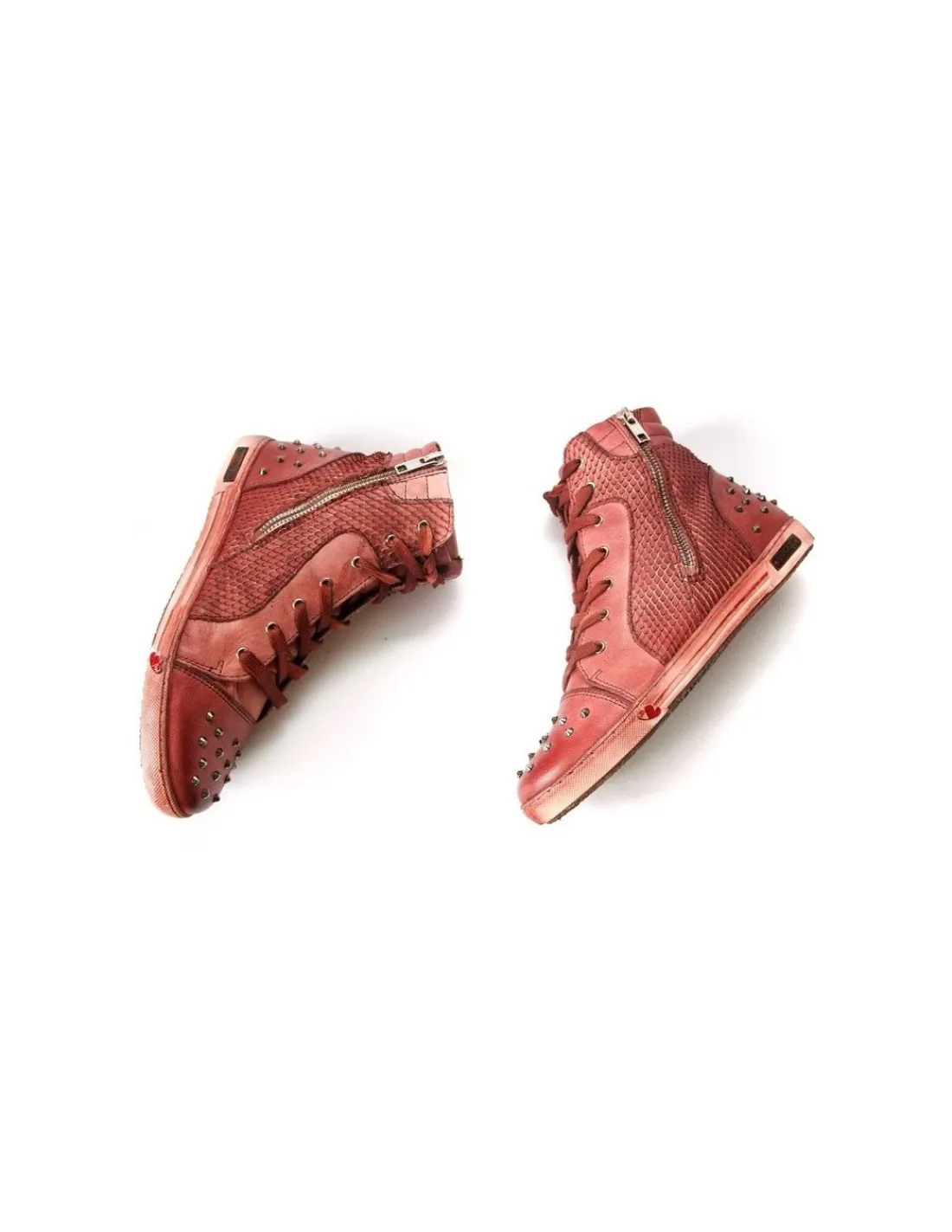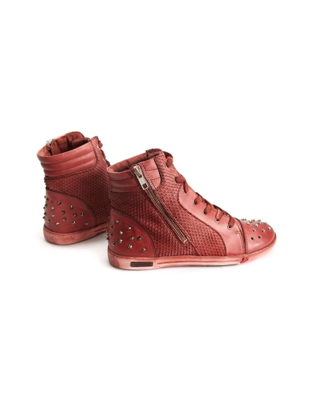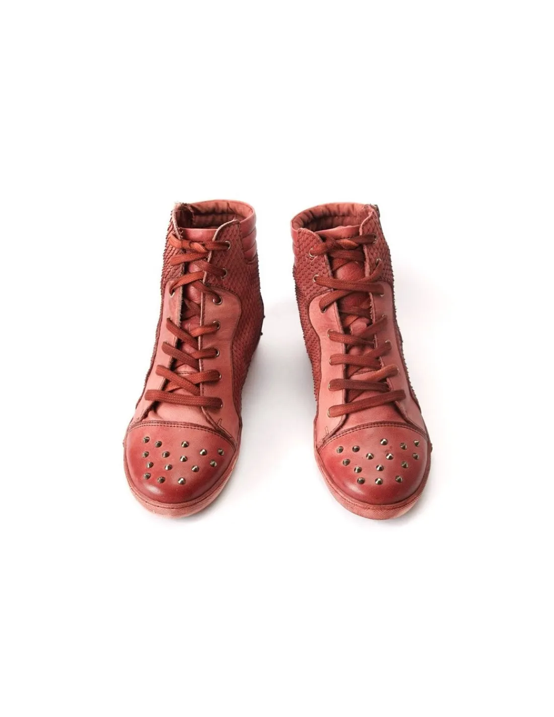 Te unikatowe, stylowe tenisówki wykonano z naturalnej skóry licowej w kolorze bordo (odcień cegły). Skóry są barwione i patynowane ręcznie, więc nasycenie kolorów nie jest jednolite. Taki był zamysł projektanta i producenta niezwykle cenionego właśnie za indywidualizm.