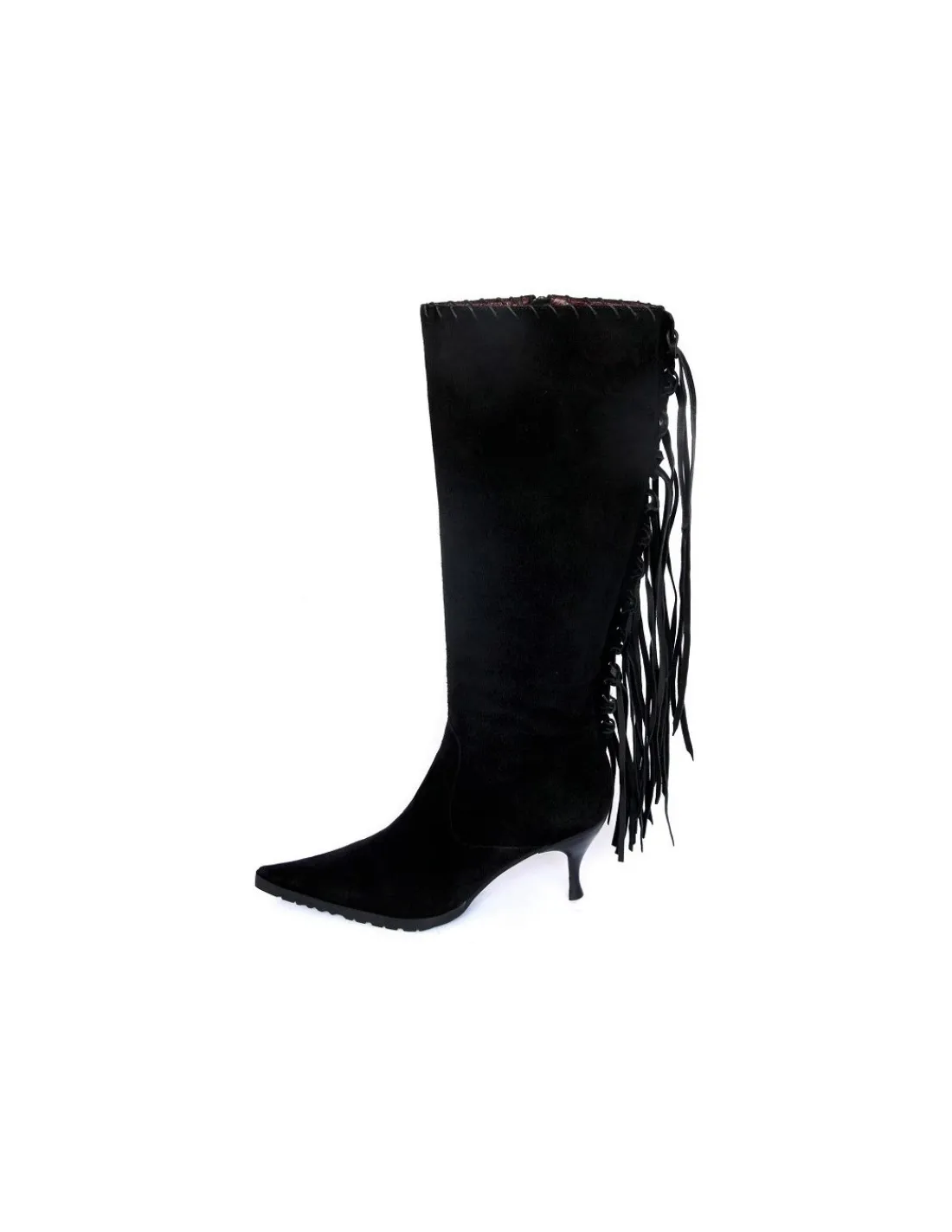 Efektowne, minimalistyczne, czarne, zamszowe kozaki. Komfortowe, łatwo poddające się podczas chodu. Efektownie prezentują się nogach. W klasycznej wysokości, nieco poniżej kolan.