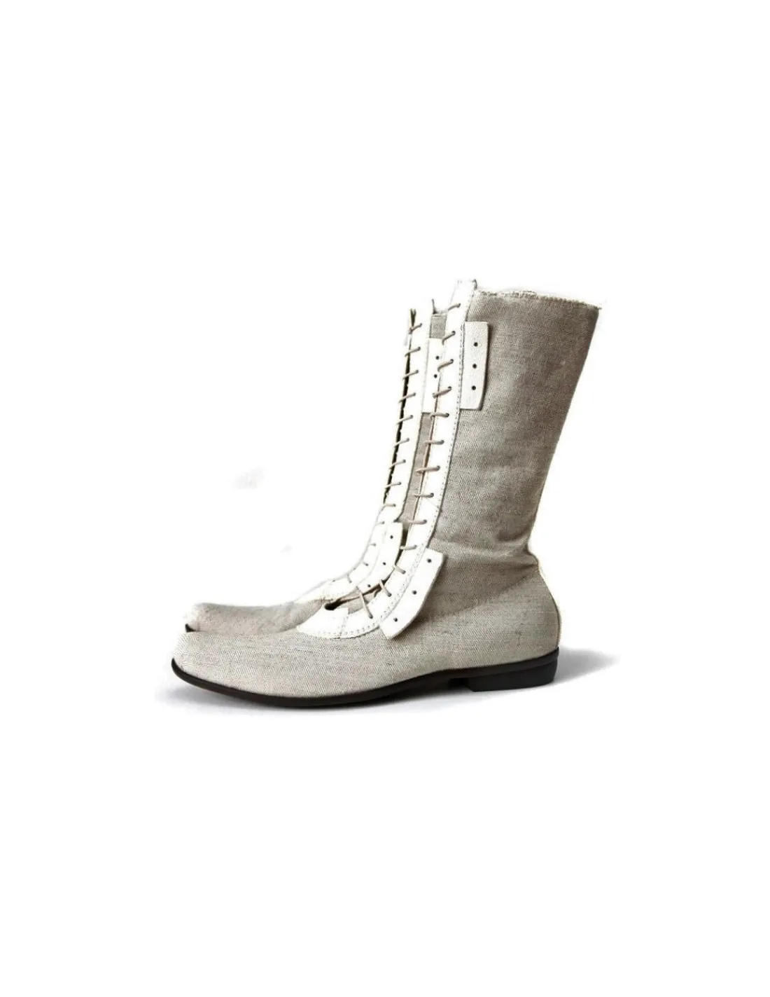 Ta tkanina ulega niewielkiemu naciąganiu ponieważ jest wyprodukowana w połączeniu ze stretchem. Wykończenie cholewki w stylistyce vintage, celowo lekko snujące się. Wnętrze obuwia do wysokości kostek oraz język wykonane zostały z naturalnej skóry w kolorze ecru.