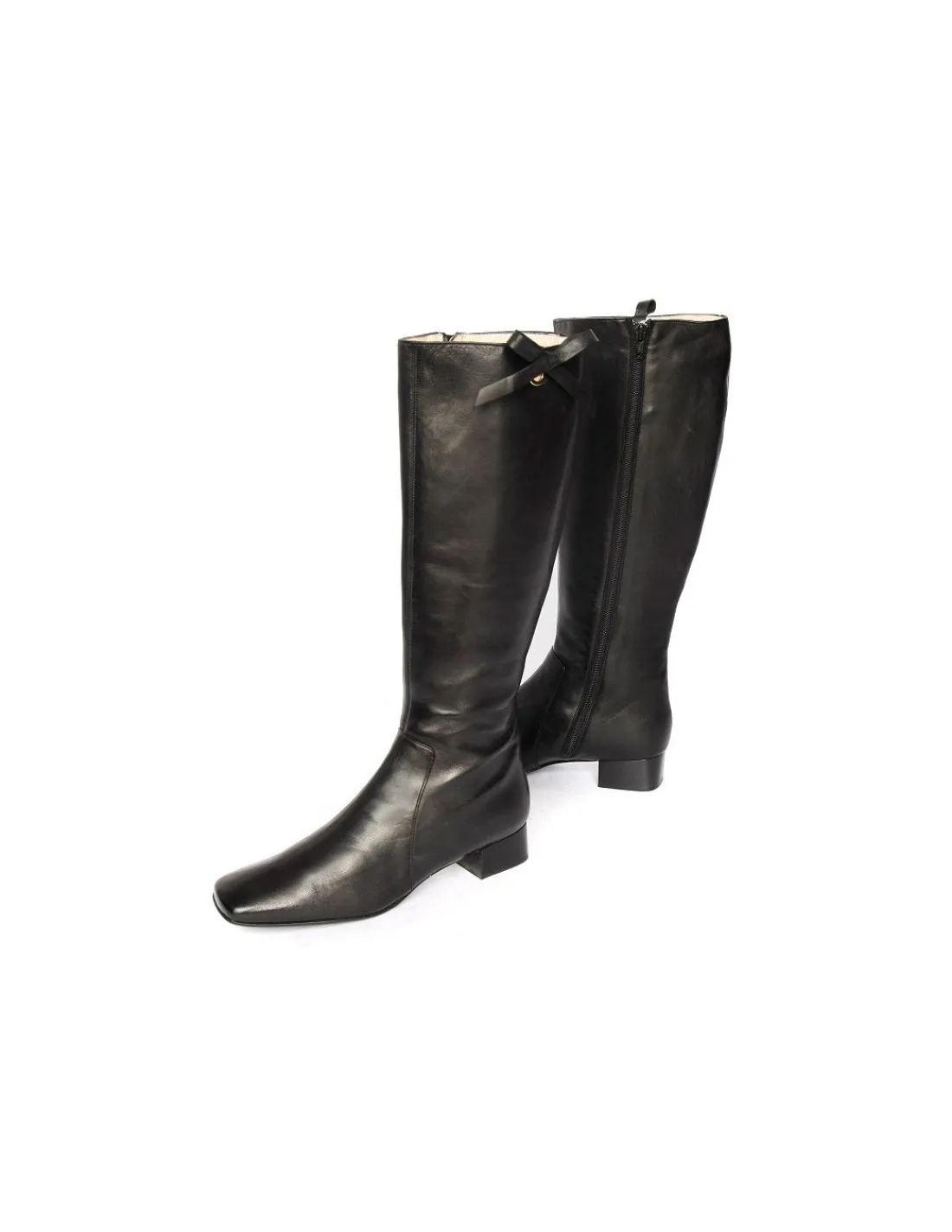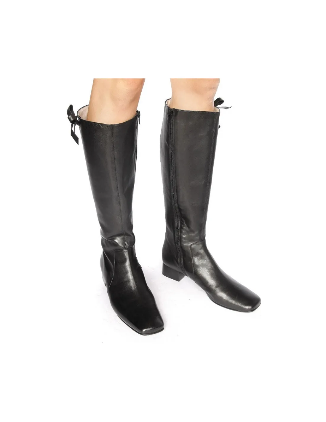 Niewiarygodnie miękkie, elastyczne, łatwo poddające się podczas chodu. Kozaki wykonane z najwyższej jakości czarnej, mięsistej skóry licowej, wręcz atlasowej w dotyku. Z boku cholewki przez dziurkę przewleczono kawałek skóry i zawiązano kokardkę – bardzo kobiece rozwiązanie, natomiast zawsze można ją odwiązać.