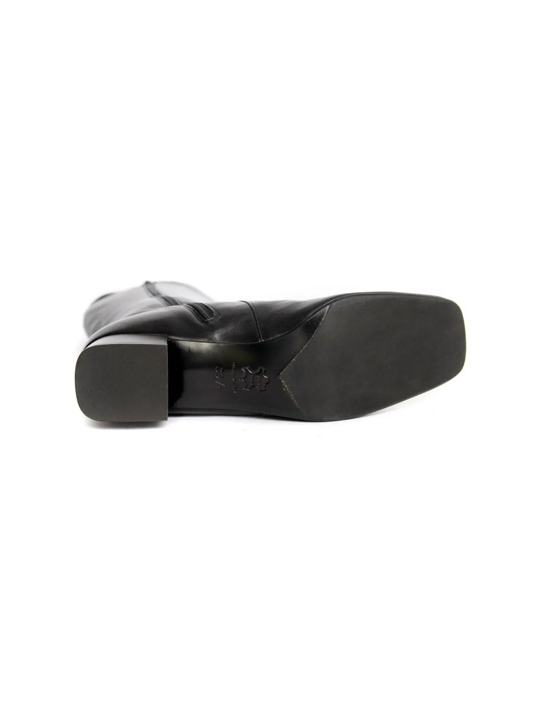 Forma nosków to zaokrąglony kwadrat. Jest szeroka, komfortowa, z łatwością pomieścić palce stóp. Wewnątrz wkładki oraz futrówki wykonane są z mięciutkiej skóry licowej w naturalnym kolorze. Cholewka profilowana – a wiec nawet kiedy nie przylega do nogi wygląda świetnie. Zapinana na zamek w kolorze czarnym po stronie przyśrodkowej. Zelówka skórzana z gumową, zabezpieczającą nakładką pod śródstopiem. Obcasy w czarnych, skórzanych obłogach.