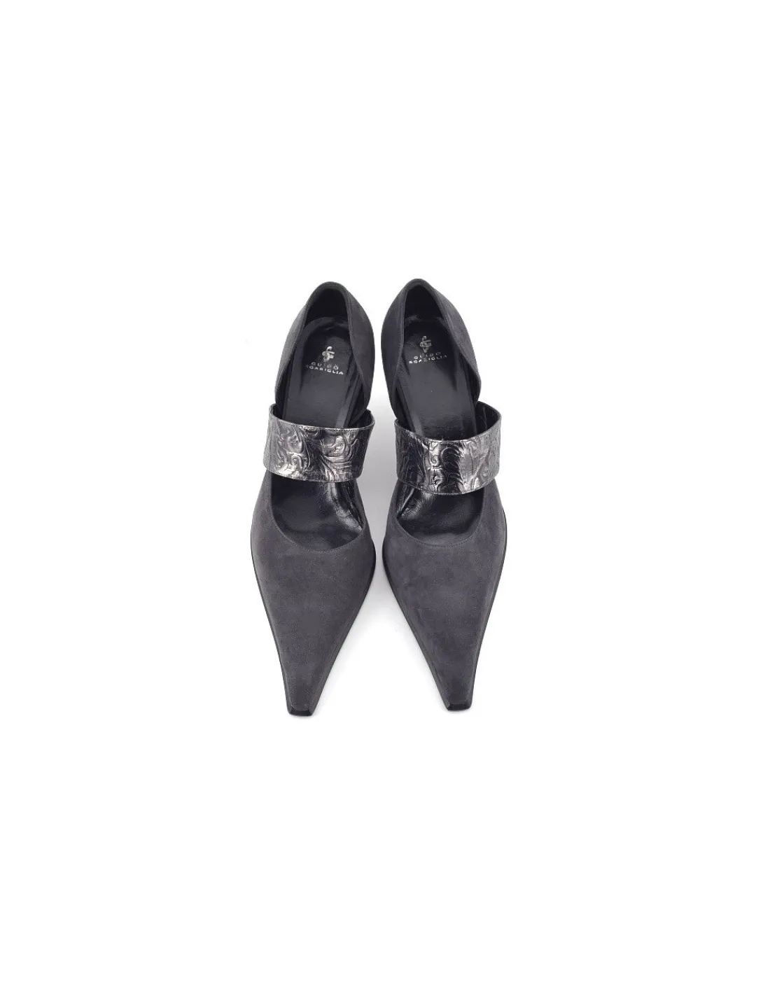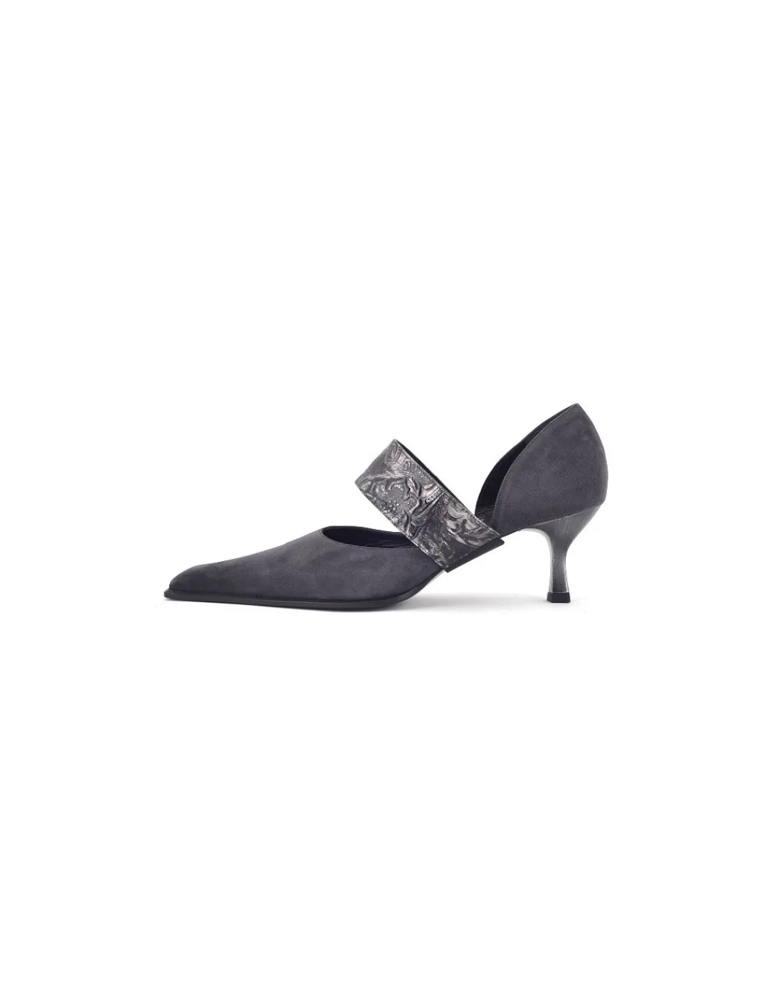 Do niewysokich szpilek projektant zaproponowała dodatkową opaskę, którą możemy założyć lub nie, uzyskując przynajmniej dwie wersje tej samej pary czółenek. Opaska oczywiście odpowiednio wyprofilowana wykonana jest również z naturalnej skóry tłoczonej w odcieniach metalicznego ołowiu, pięknie komponująca się kolorystycznie z zamszem i metalicznymi obcasami w kształcie szpileczek. Od strony zelówki opaska wykończona jest gumą więc bez problemu możemy ją założyć.