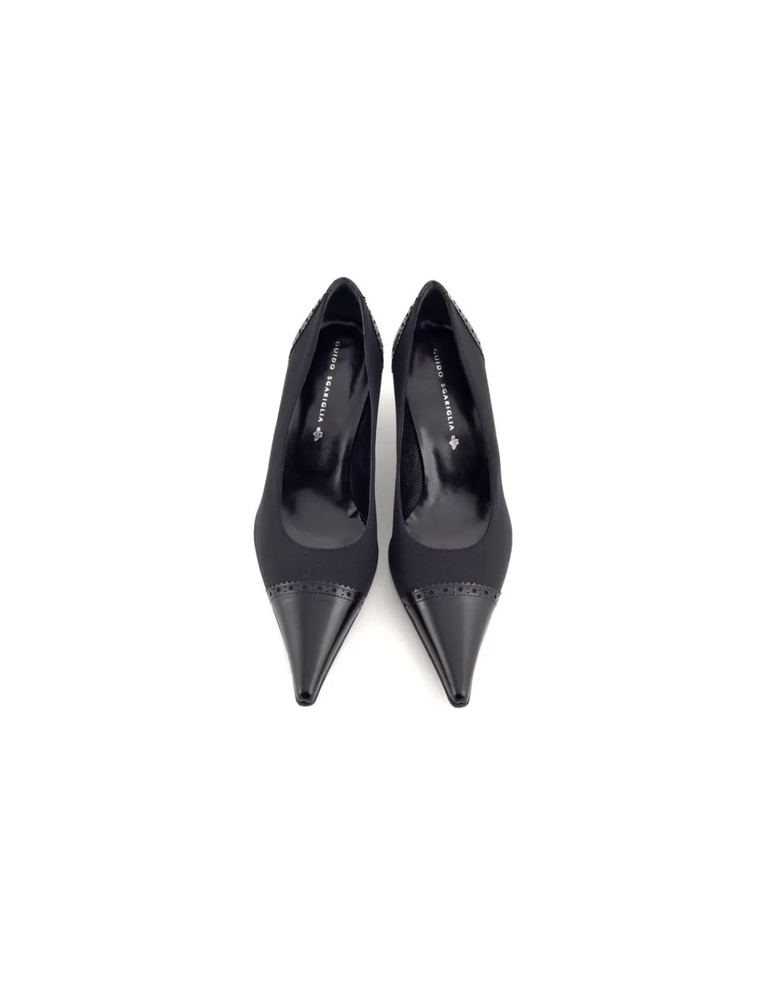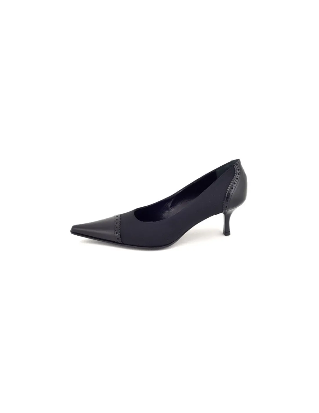 Model bardzo delikatny, subtelny i kobiecy. Wykonany z połączenia czarnej tkaniny o grubym splocie oraz skóry licowej, polerowanej. Tkaniny techniczne są precyzyjnie dopasowane, zabezpieczone, całość dopracowana na najwyższym poziomie przez mistrzów sztuki szewskiej. Skóra na noskach i zapiętkach z efektownymi ażurowaniami zapożyczonymi z męskiej szafy z butów typu brogues , co bardzo podkreśla szlachetność tego modelu.