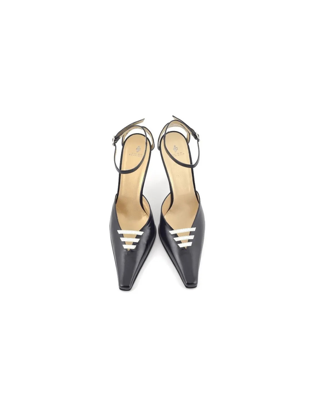 A tak przedstawiają się lekkie czółenka z otwarta piętą zawsze modne, bo ponad czasowe w formie i w perfekcyjnej jakości wykonaniu w każdym detalu. Wykonane są z naturalnej miękkiej skóry cielęcej w czarnym kolorze. Kobiece wycięcie na wysokości podbicia jest efektownie wykończone potrójnymi paseczkami w kontrastowym kolorze ecru. Podobny efekt powtórzony został jako zabudowanie pięt. Czarny pasek okalający nogi powyżej kostek zakończono małymi, metalowymi klamerkami pozwalającymi na łatwe ich dopasowanie.