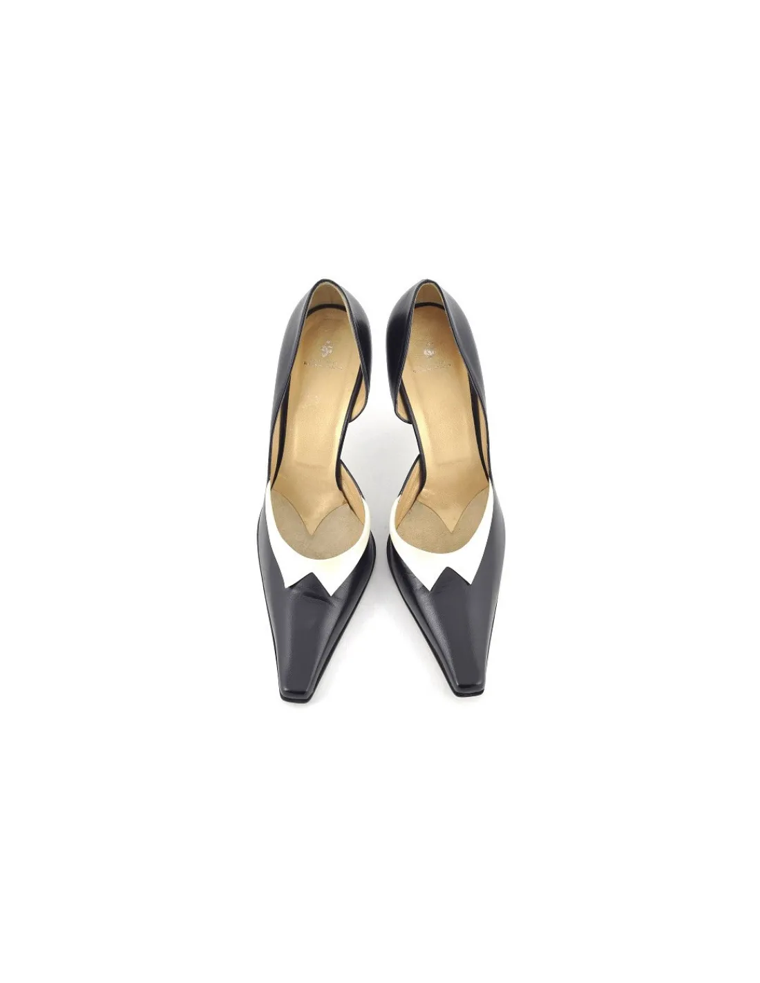 Wykonane z naturalnej skóry bydlęcej w czarnym kolorze z satynowym połyskiem. Kobiece wycięcie od strony przy-środkowej na wysokości podbicia podkreśla piękną część kobiecych stóp. Jedyną ozdobną przy tym minimalistycznym fasonie jest wycięcie cholewki z wykończeniem niczym kołnierzyk z jasnej, kremowej, écru skóry, zupełnie jak dla pensjonarki. Forma szpilek wysmuklona z delikatnie odciętym noskiem.
