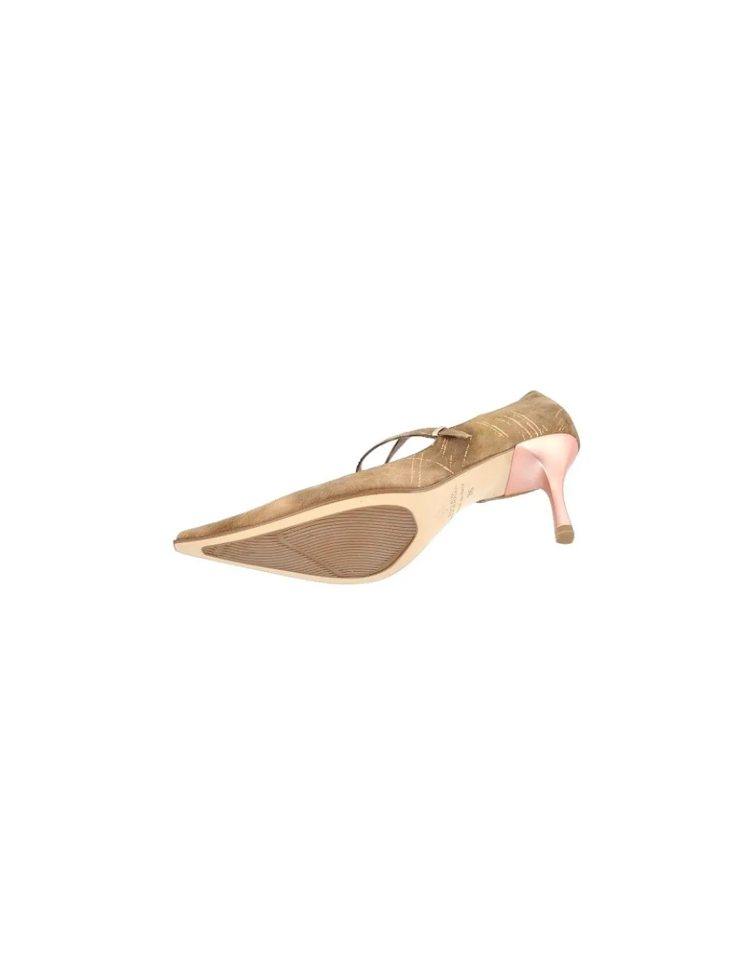 Obcas w formie niewysokiej szpilki został wykonany z metalicznego tworzywa w kolorze różowego złota (odcień graffiti na zamszowej skórze). Zelówki skórzane, logowane i lakierowane.