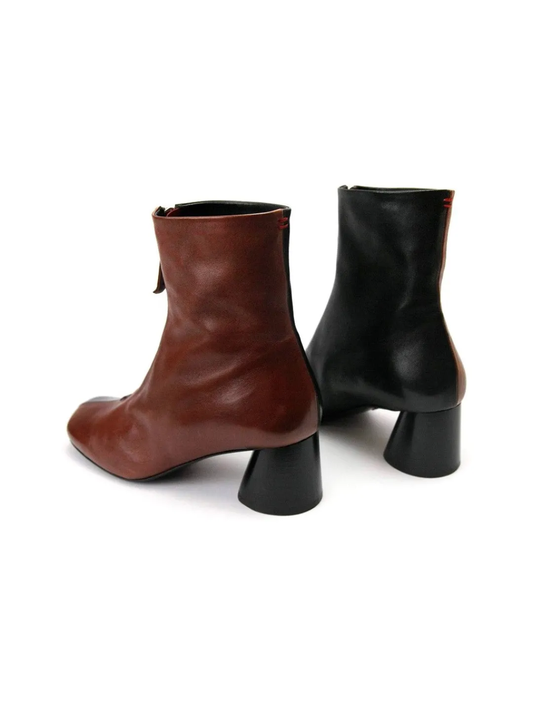 Minimalistyczne w formie. Żadnych zdobień, tylko prostota, a jednak … przykuwają spojrzenia. A to dzięki zastosowaniu podziału na dwa kolory. Równo, dosłownie jak przecięte na pół, miękka, miła w dotyku barania skóra ze szlachetnym, satynowym połyskiem została zastosowana w dwóch kolorach: czarnym i brązowym. Interesujący projekt i wykonanie.