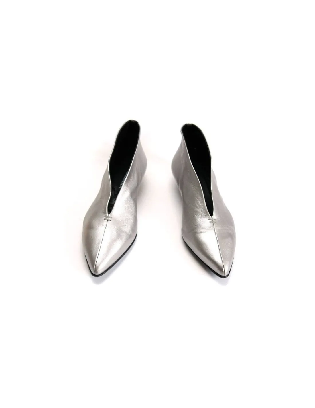 Skóra licowa ( nappa) jest bardzo miękka, tutaj w kolorze satynowego, matowego srebra . Wycięcia cholewek gwarantują stabilizację stóp. Są głęboko zabudowane bez zbędnych szyć i łączeń. Doskonale nadają się niemal dla wszystkich stóp w tym również dla tych niedoskonałych. Prezentują się bardzo zgrabnie.