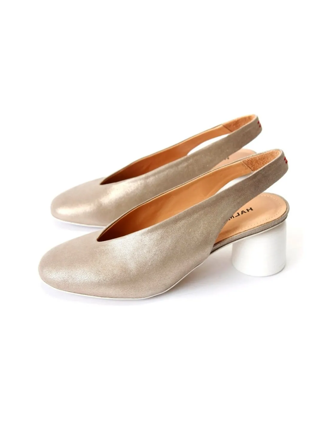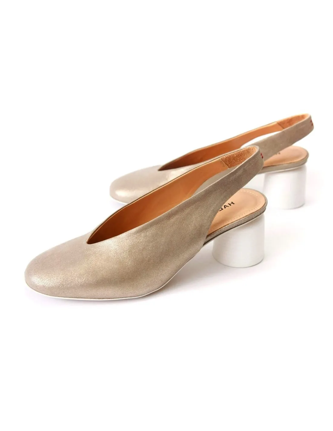 Białe w skórzanych obłogach o kształcie zbliżonym do walca o nieco szerszej podstawie, która gwarantuje również stabilizację i poczucie pewności pomimo skłonu stóp.