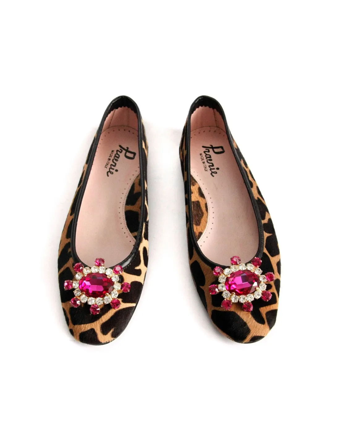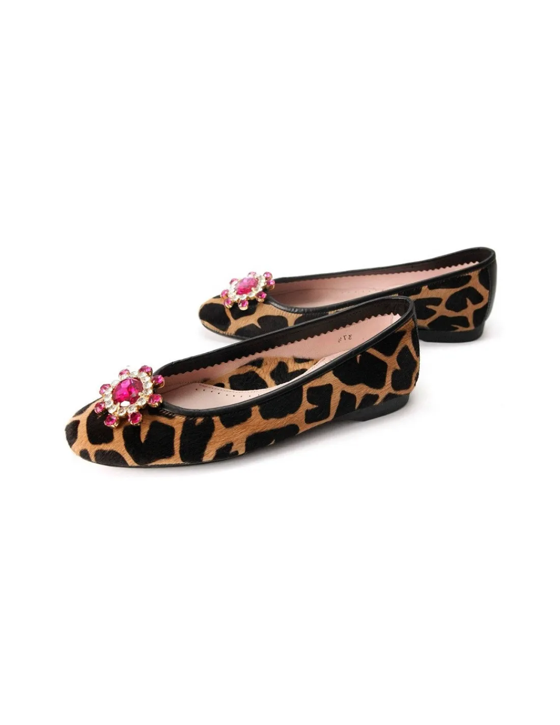 Te balerinki wykonane zostały z naturalnej skóry z pozostawionym włosiem, z printem zwierzęcym na wzór leoparda – w cętki o odcieniach brązu i beżu. Niebywale interesującym dodatkiem są ozdobne, duże, różowe kryształy odbijające światło oprawione w metalu o złotym kolorze. Przepych i bogactwo w tym wydaniu jest niebywale kobiecy, trochę ekscentryczny i na pewno wyjątkowy. Ten bukiet kryształów osadzony został pomiędzy wycięciem cholewki i noskami. Efektownie komponująca się linia, wysmukla nogi i sylwetkę mimo braku obcasów. Cholewka wykończona jest rulonikiem czarnej skóry, dzięki temu po założeniu na stopy baleriny nie „otwierają się”. Buty wykonane zostały z jednego kawałka skóry ze szwem w linii pięty , maskowanym i wykończonym podobnie jak wykrój cholewek czarną skórą. Całe wnętrze balerinek, czyli zarówno wkładki jak i futrówki również wykonane zostało z naturalnej skóry w kolorze pudrowego różu. Obcasy niewielkie , wyodrębnione w czarnych skórzanych obłogach.
