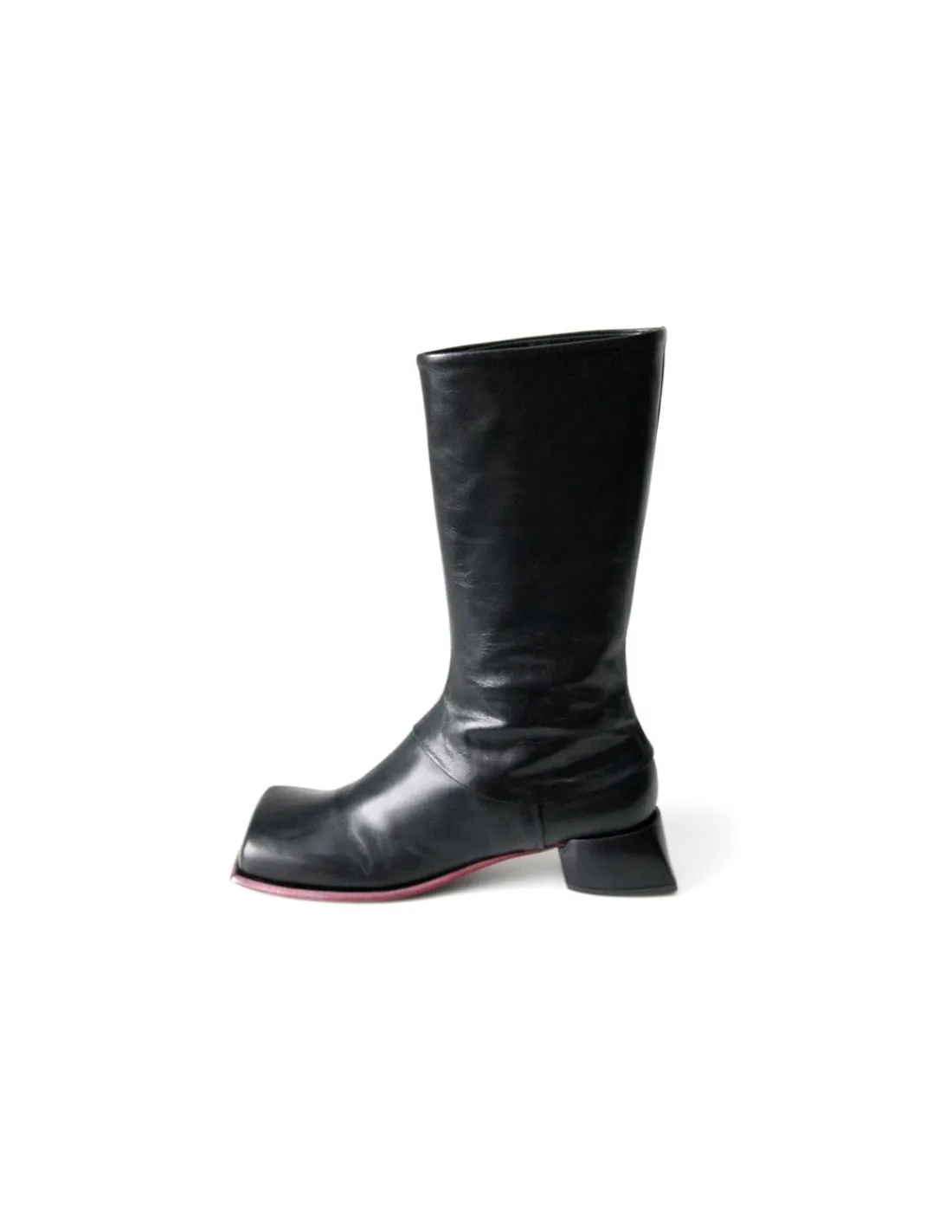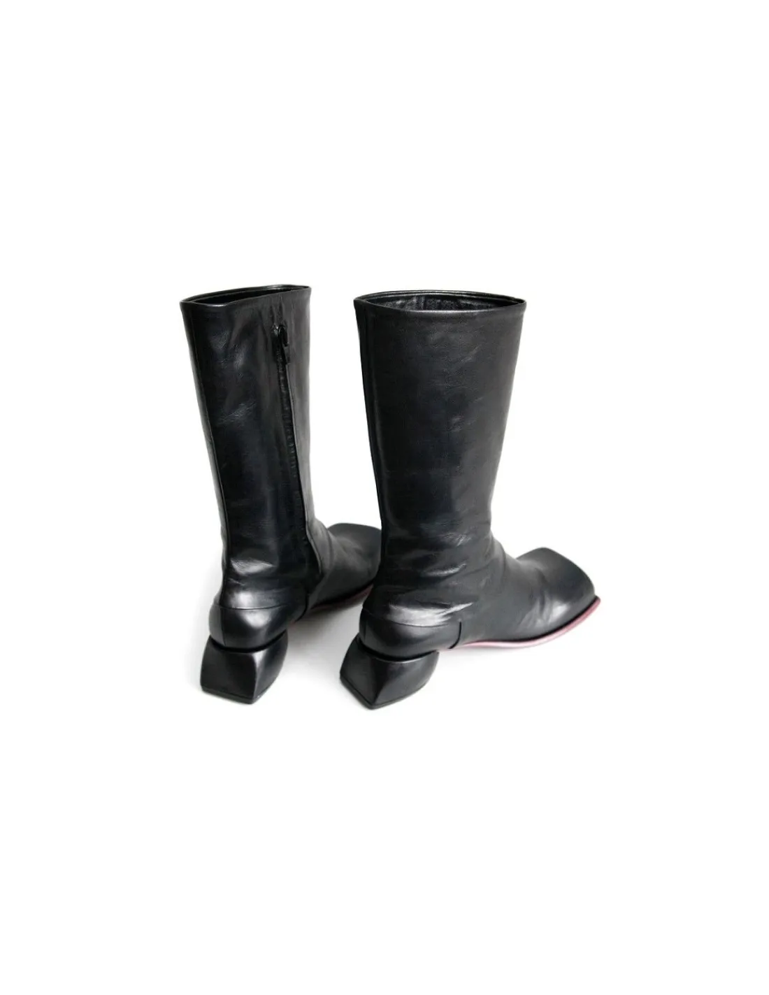 Absolutnie unikatowe, przemyślane w detalach, wytwarzane w ogromnej części rękami rzemieślników. Te kozaki zostały wykonane z najwyższej jakości, miękkiej skóry cielęcej w kolorze czarnym. Pasują do wielu stylizacji. Są zdecydowanie stworzone z finezją i to wielką, ale nikt nie zapomniał tu o wygodzie, komforcie podczas korzystania z nich. Noski kwadratowe, szerokie, zdecydowanie podniesione i nieco przerysowane. Przyciągają, uwagę i zaskakują swoją prostotą. Z pewnością nie przejdziesz w nich niezauważona. Dla ich podkreślenia skórzany otok zelówek został patynowany na bordowy kolor. Wewnątrz wkładka i futrówka wykonane z naturalnej cielęcej skóry – niesamowicie miękkiej, w kolorze czarnym.