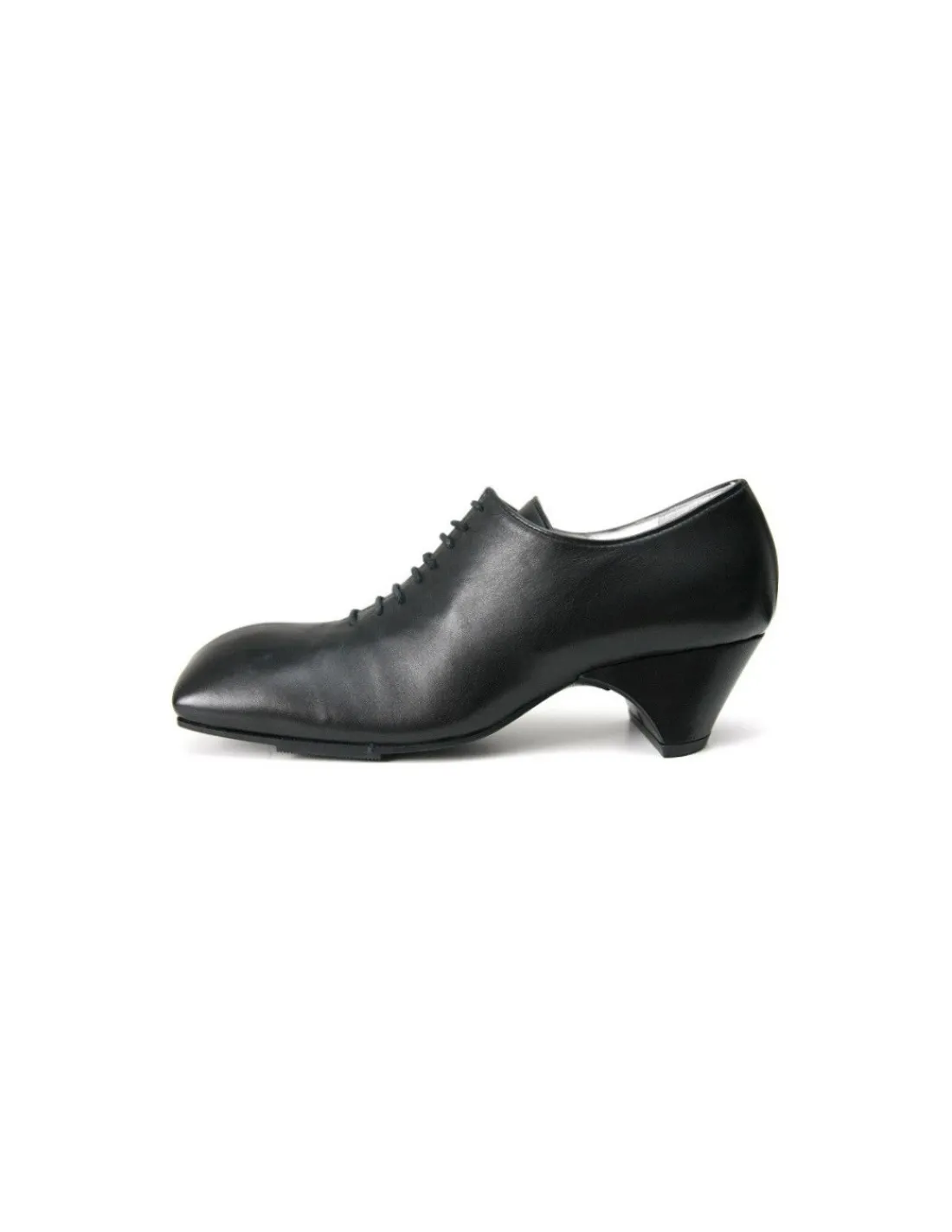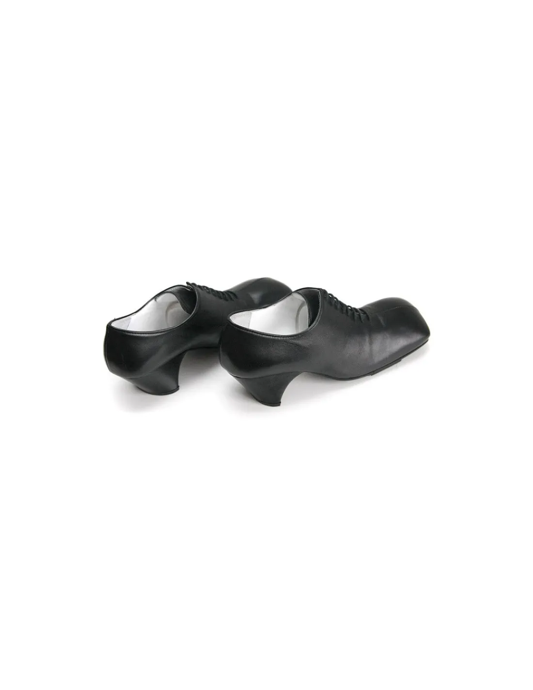 Absolutnie unikatowe, przemyślane w detalach, wytwarzane w ogromnej części rękami rzemieślników. Te półbuty zostały wykonane z najwyższej jakości, aksamitnej w dotyku czarnej skóry licowej. Skóra jest tak miękka jak ta używana do produkcji rękawiczek. Są zdecydowanie stworzone z finezją i to wielką, ale nikt nie zapomniał tu o wygodzie. Noski kwadratowe, szerokie, zdecydowanie podniesione i nieco przerysowane. Przyciągają, uwagę i zaskakują swoją prostotą. Z pewnością nie przejdziesz w nich niezauważona Wewnątrz wkładka i futrówka wykonane z naturalnej, cielęcej skóry – niesamowicie miękkiej, w kolorze białym.