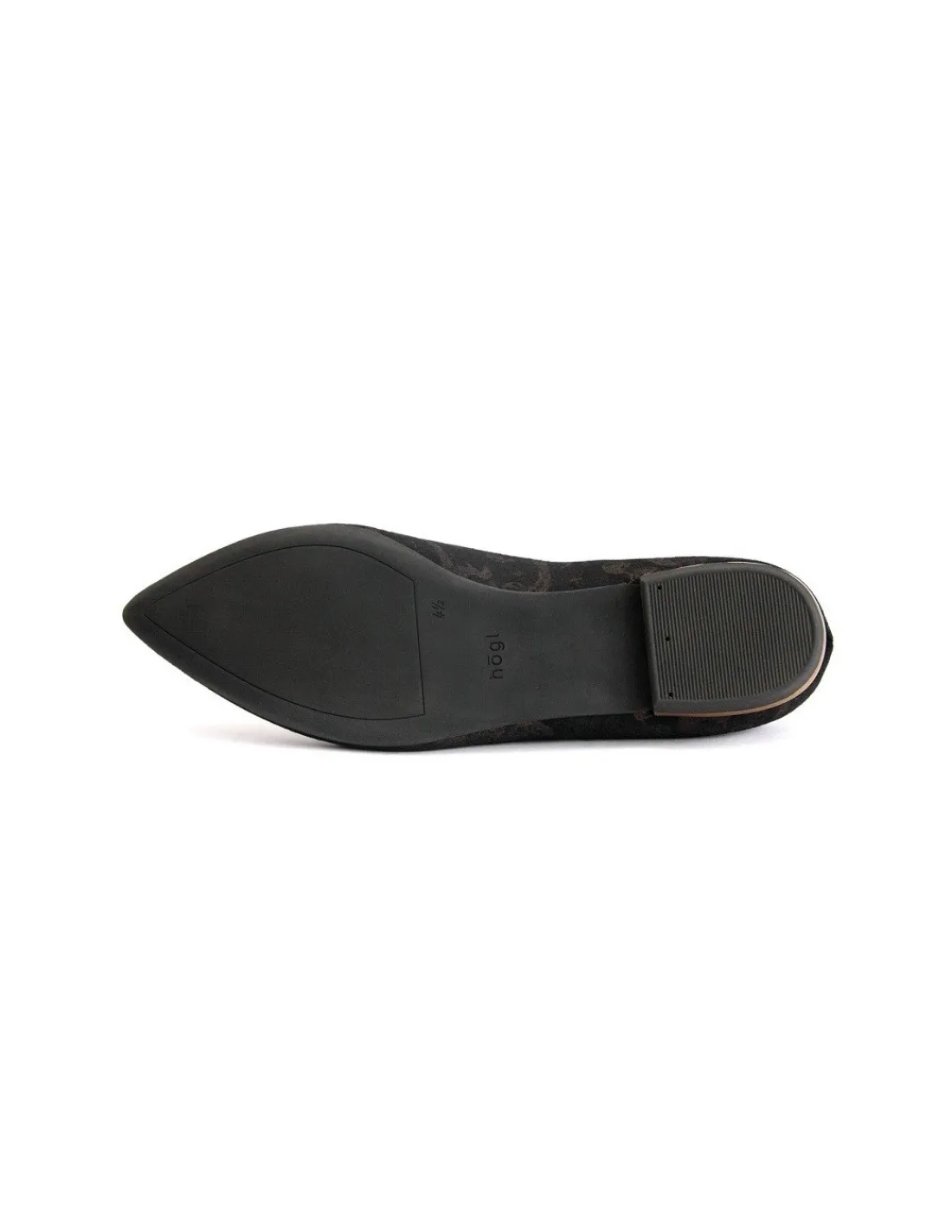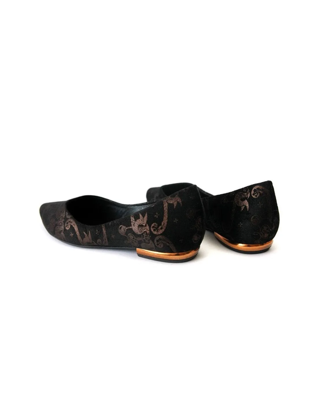 Baleriny zostały wykonane z najwyższej jakości, miękkiego, czarnego weluru z delikatnym, złoto – mosiężnym ornamentem. Wkładki i futrówki wykonano ze skóry cielęcej w czarnym kolorze. Ten rodzaj skóry jest niesłychanie miękki. Malutkie, niskie, płaskie, szerokie obcasy wykonane z wytrzymałego tworzywa w kolorze starego złota.