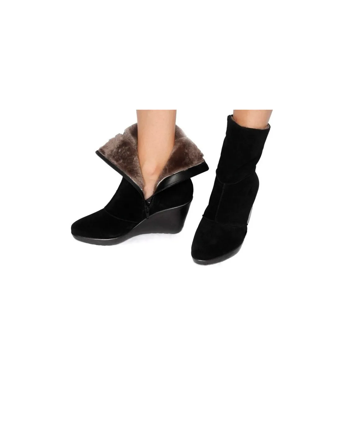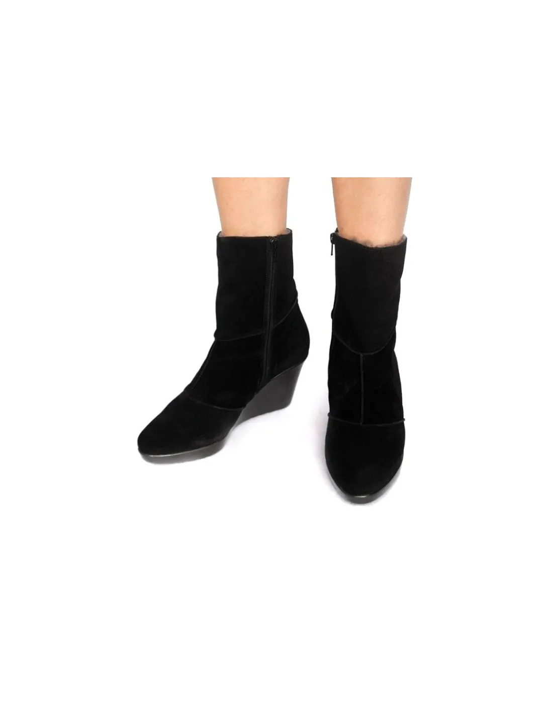 Miękkie, komfortowe miejskie botki wykonane z najwyższej jakości skóry zamszowej w pięknym głębokim, czarnym kolorze. Widoczne na zewnątrz szwy przypominają szycia jakie występują w kożuchach. Wszystko dlatego, że futrówki i wkładki wykonane są w całości z 100% naturalnego baraniego runa.