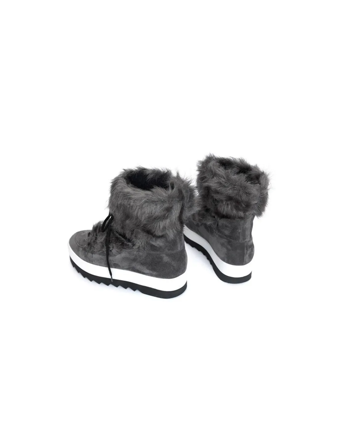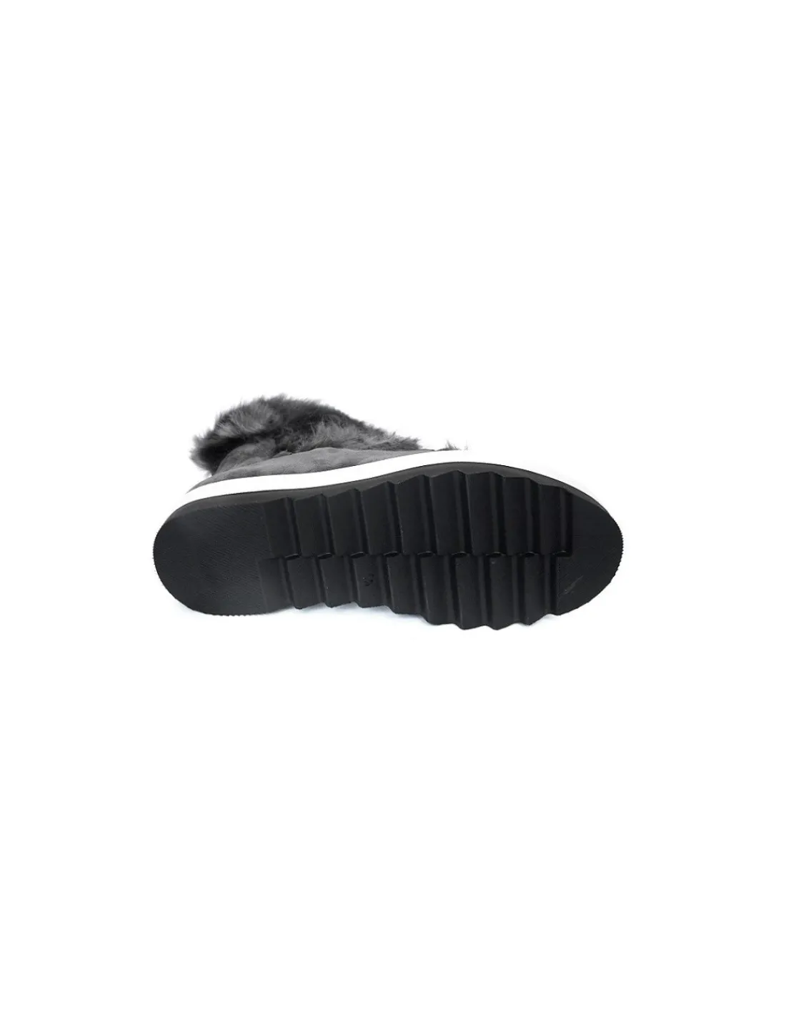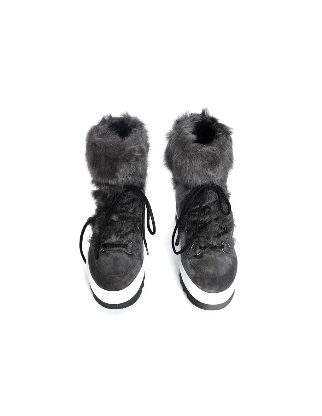 Górna cześć cholewek oraz języki wykończone bardzo miłym w dotyku sztucznym futerkiem w stonowanym z zamszem kolorze szarym. Botki sznurowane wzdłuż linii podbicia prawie na całej długości cholewek. Wystarczy tylko raz dopasować je i zasznurować, a kolejne ich założenie odbędzie się w tak zwanym „oka mgnieniu”. Metalowe uchwyty na sznurowadła są w kolorze srebrnym.