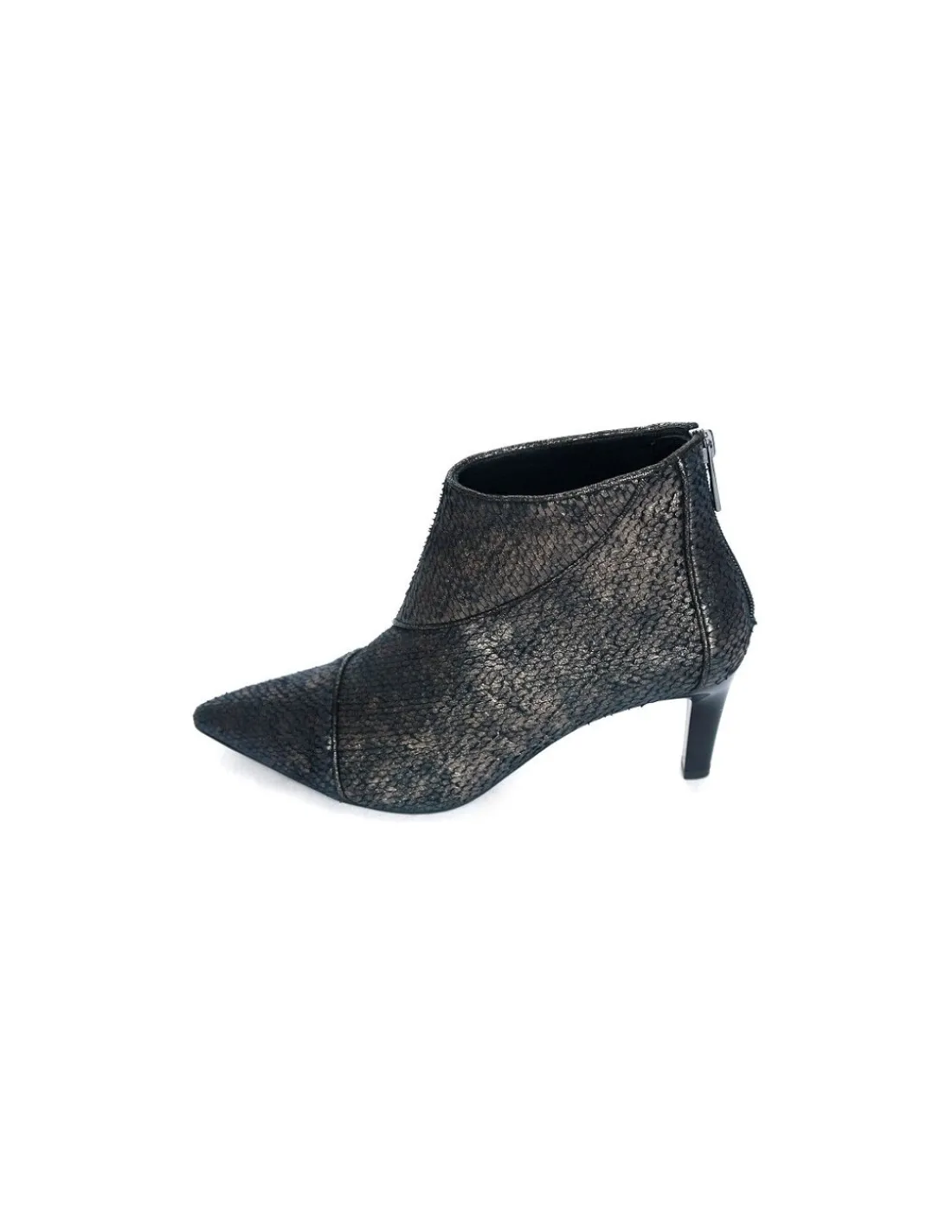 Botki wykonane z najwyższej jakości skóry licowej, nacinanej laserowo na wzór wężowej łuski. Skóra barwiona, patynowana na metaliczny grafitowy kolor. Spod patynowania widoczny jest ciemno granatowy odcień.