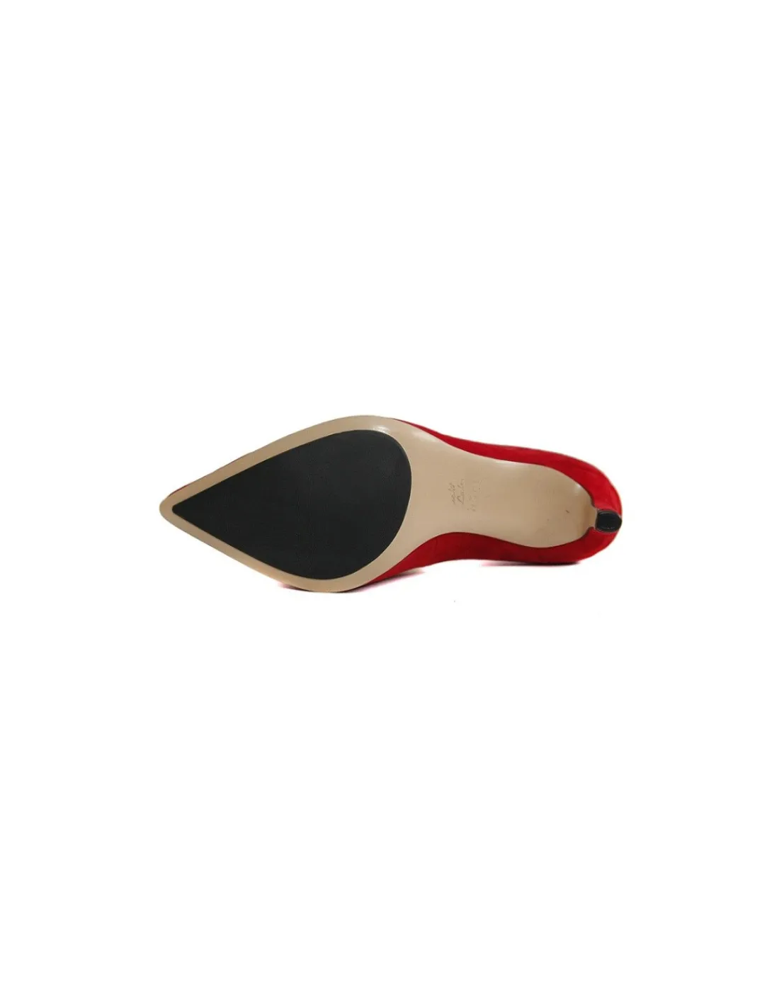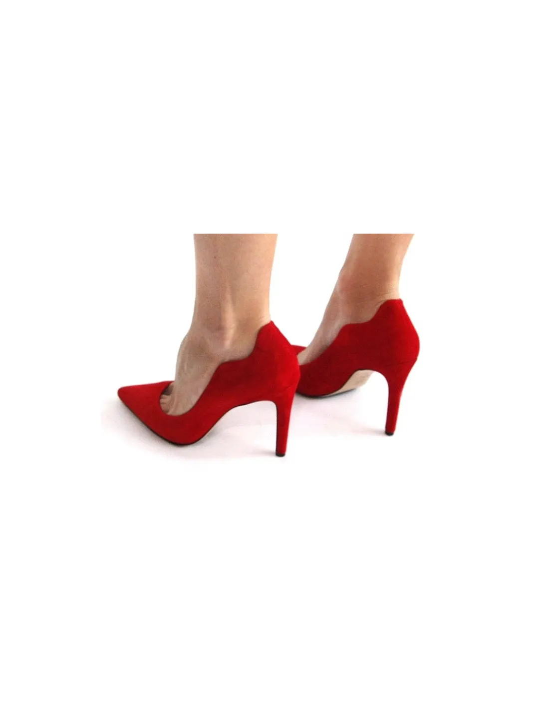 Wykonane z najwyższej jakości, miękkiego, krwistoczerwonego zamszu. Forma czółenek wysmuklona z noskami w szpic, uwierzcie, że z zachowaniem ergonomii. Wnętrze z bardzo miękkiej skóry licowej w naturalnym kolorze. Pod śródstopiem ukryta miękka silikonowa wkładka wywołując radość i zadowolenie na twarzach naszych Klientek. Obcasy są proste w linii piety, również obłożone czerwonym zamszem.