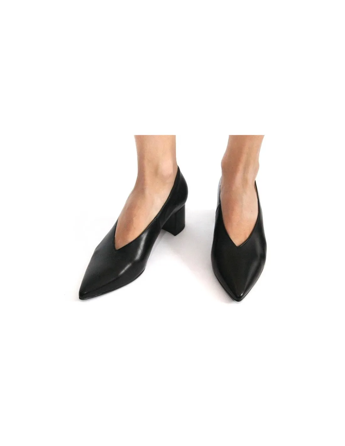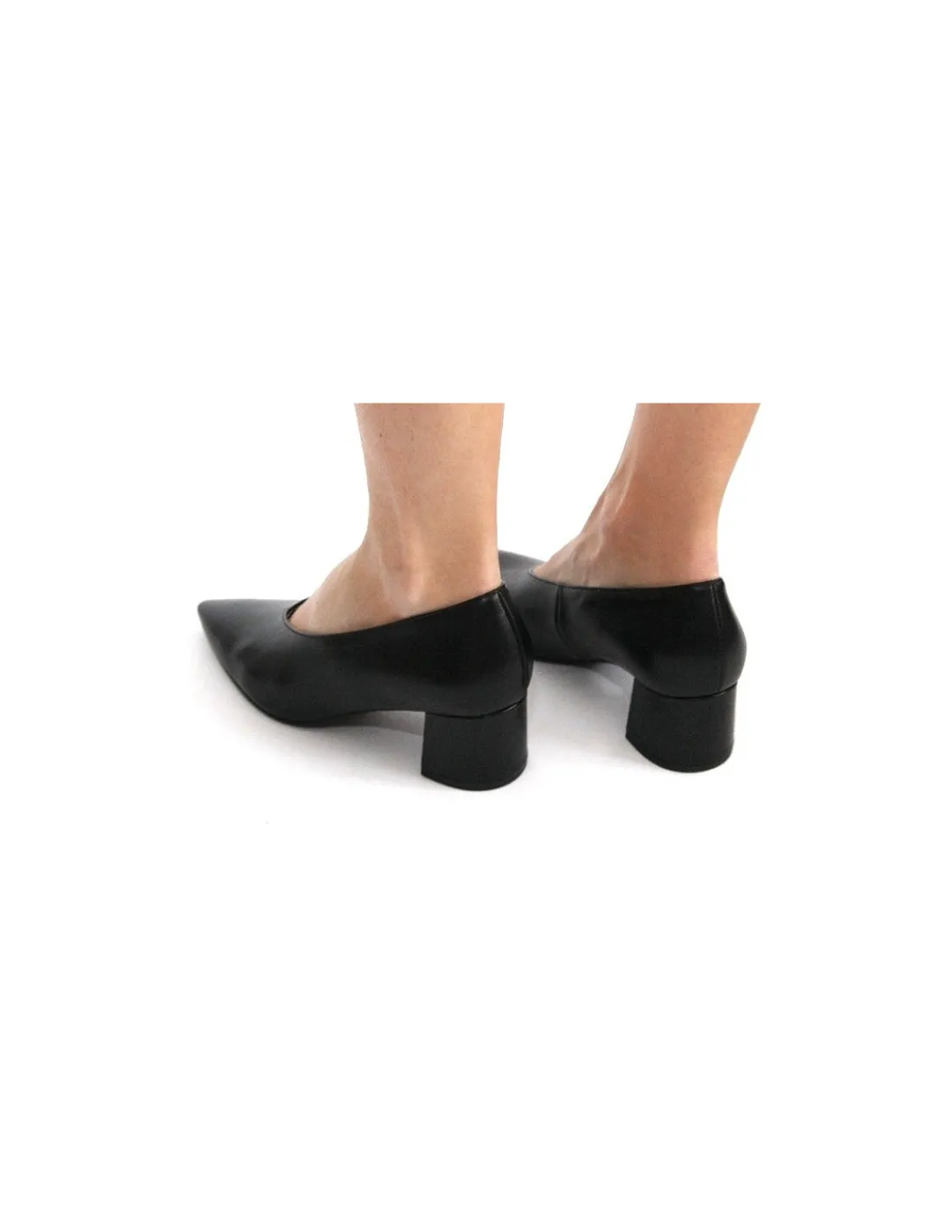 Czółenka wykonane zostały z najwyższej jakości skóry licowej w czarnym kolorze. Skóra z której wykonano tą parę jest bardzo miękka, jej jakość jest bardzo ważna bowiem gwarantuje , że łatwo dopasowuje się do stóp. Forma czółenek wysmuklona z noskami zakończonymi w szpic, ale szeroka na tyle by z łatwością i komfortem spędzić w nich nawet bardzo pracowity i długi dzień.