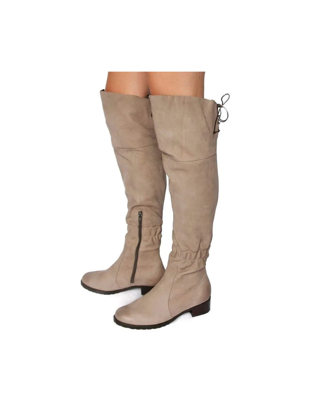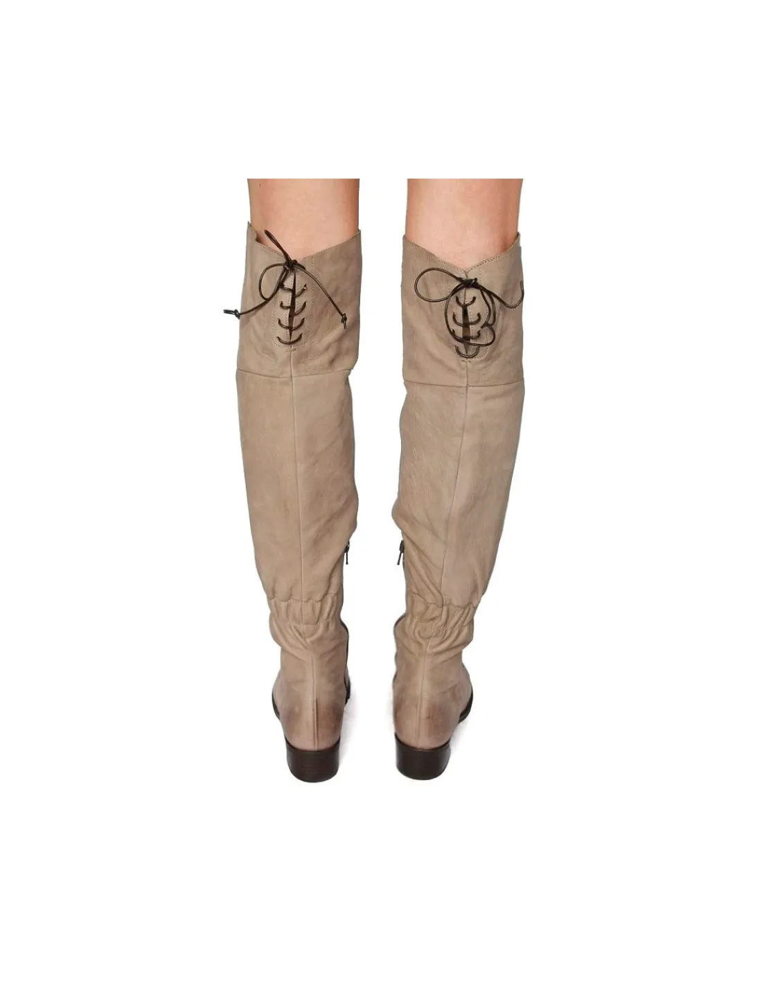 Komfortowe, łatwo poddające się podczas chodu. Kozaki – muszkieterki wykonane ze skóry nubuk w jasnym kolorze beżowym w kamiennej tonacji. Skóra na noskach oraz piętach jest patynowana, postarzana dla osiągnięcia efektu vintage.