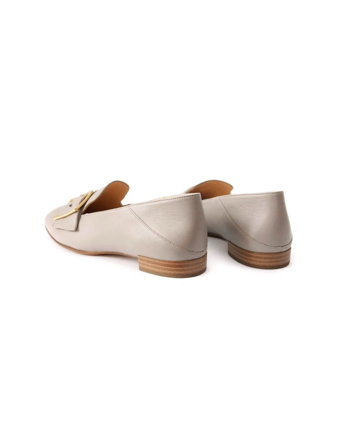 Mokasyny ozdobione skórzanym paskiem obejmującym stopy na wysokości podbicia, na którym zamontowano złotą klamrę. Elegancka, dyskretna ozdoba świetnie prezentująca się na tle jasnej, matowej skóry.