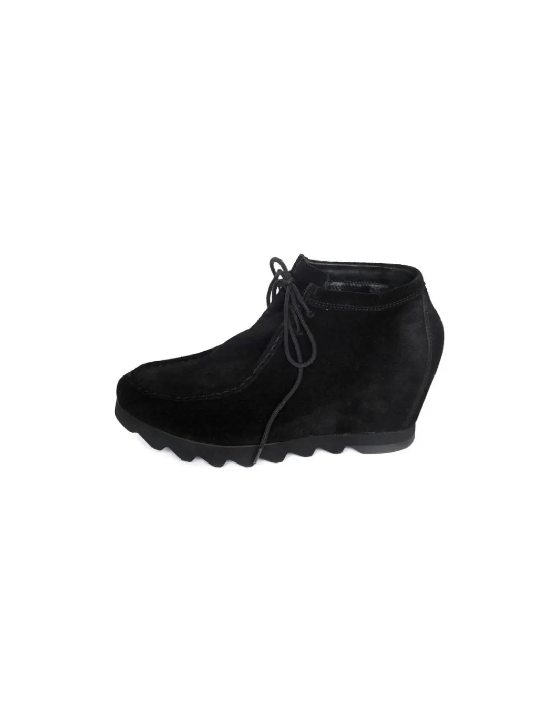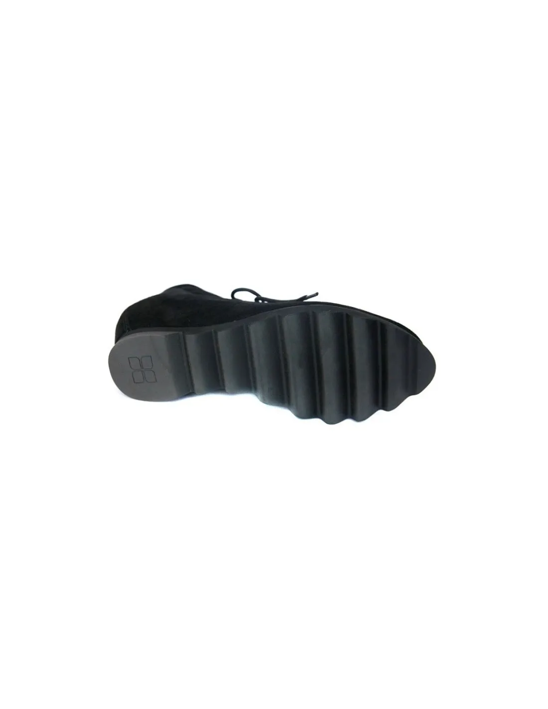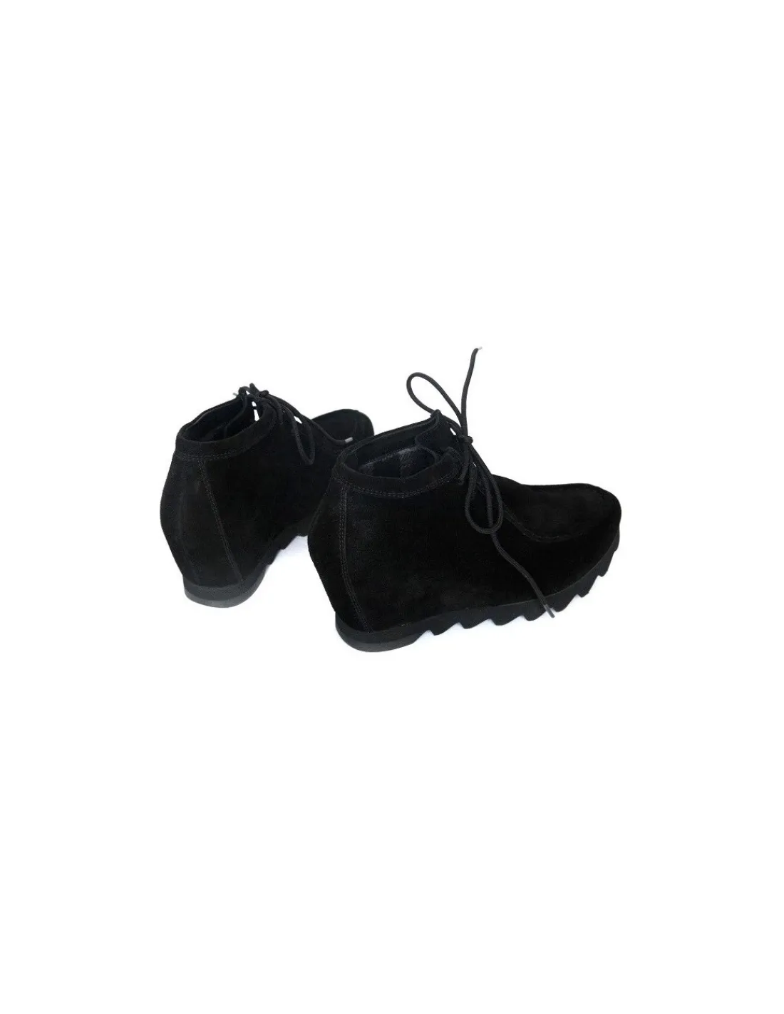 Klasyczne półbuty z ukrytym koturnem. Wykonane z doskonałej jakości, mięsistej, miękkiej, czarnej skóry zamszowej. Jej miękkość pozwoliła na konstrukcję modelu vintage w stylu lat 50-tych – szycia charakterystyczne dla mokasynów zostały wyciągnięte aż w okolice kostki. Powstały szew stebnowany grubą nicią podkreśla mokasynowy styl. Taki model nie starzeje się, to iconic najbardziej popularnych wówczas butów, butów z lat 50-tych.