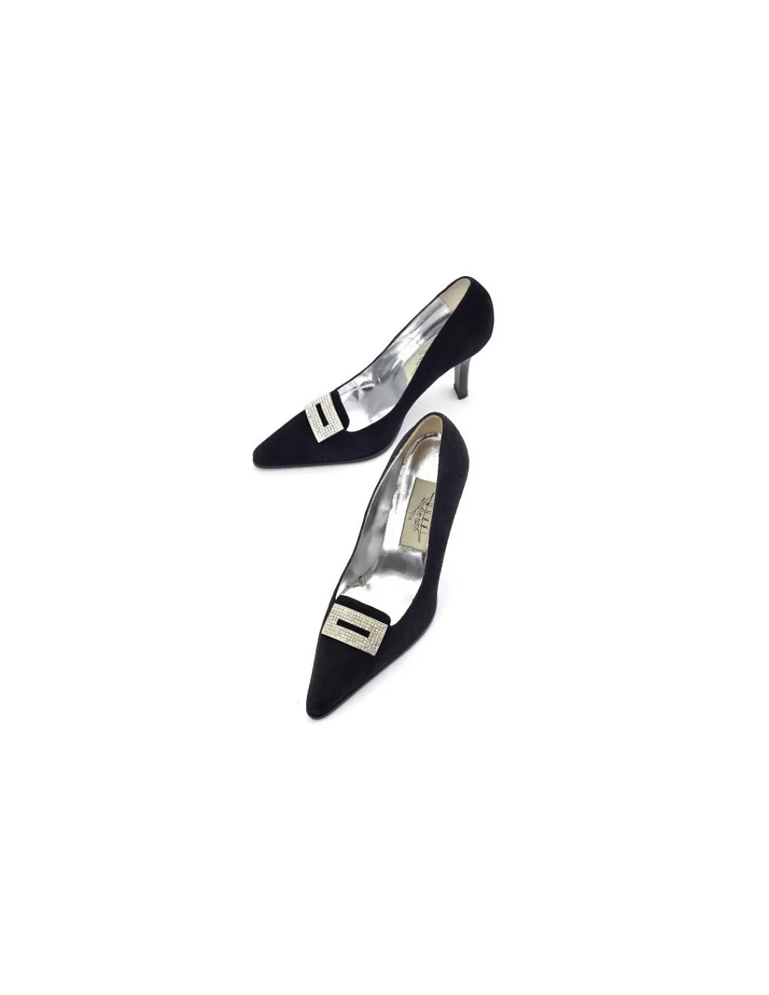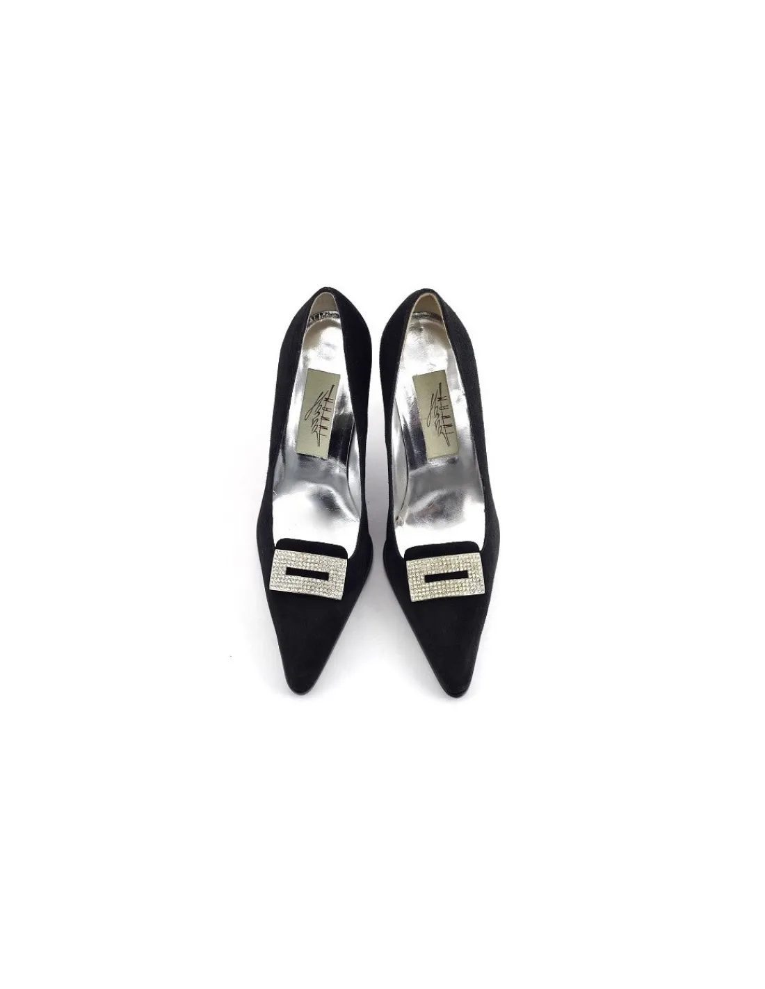 Wykonane z najwyższej jakości, mięciutkiego zamszu z krótkimi, aksamitnymi w dotyku włoskami. Forma nosków w szpic, ale z łatwością mieści palce stóp. Dla podkreślenia okazjonalnego przeznaczenia, na noskach zamontowano ozdoby w kształcie prostokątnych broszek w kolorze srebrnym, wysadzane połyskującymi cyrkoniami. Wewnątrz wkładki i futrówki z bardzo miękkiej skóry licowej w kolorze srebrnym, podbijając efekt wyjątkowości tej pary. Obcasy wykonane z czarnego, tworzywa. Z tyłu szersze, a z boku cieńsze co bardzo pomaga w stabilności. Forma tych szpilek jest świetnie wyprofilowana – jednak i tak przy tej wysokości przeznaczone są raczej dla tych z Was, które mają doświadczenie w poruszaniu się na wysokościach. Zelówki również skórzane, w czarnym kolorze, zabezpieczone warstwą lakieru. Wykonane z dbałością o detal w pięknym stylu dyskretnej elegancji. Po prostu ponadczasowa klasyka.