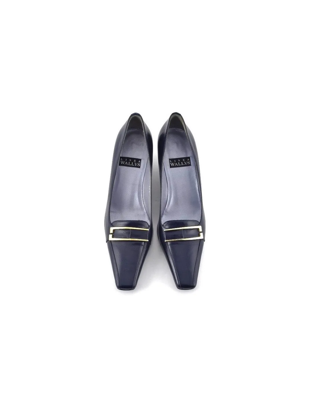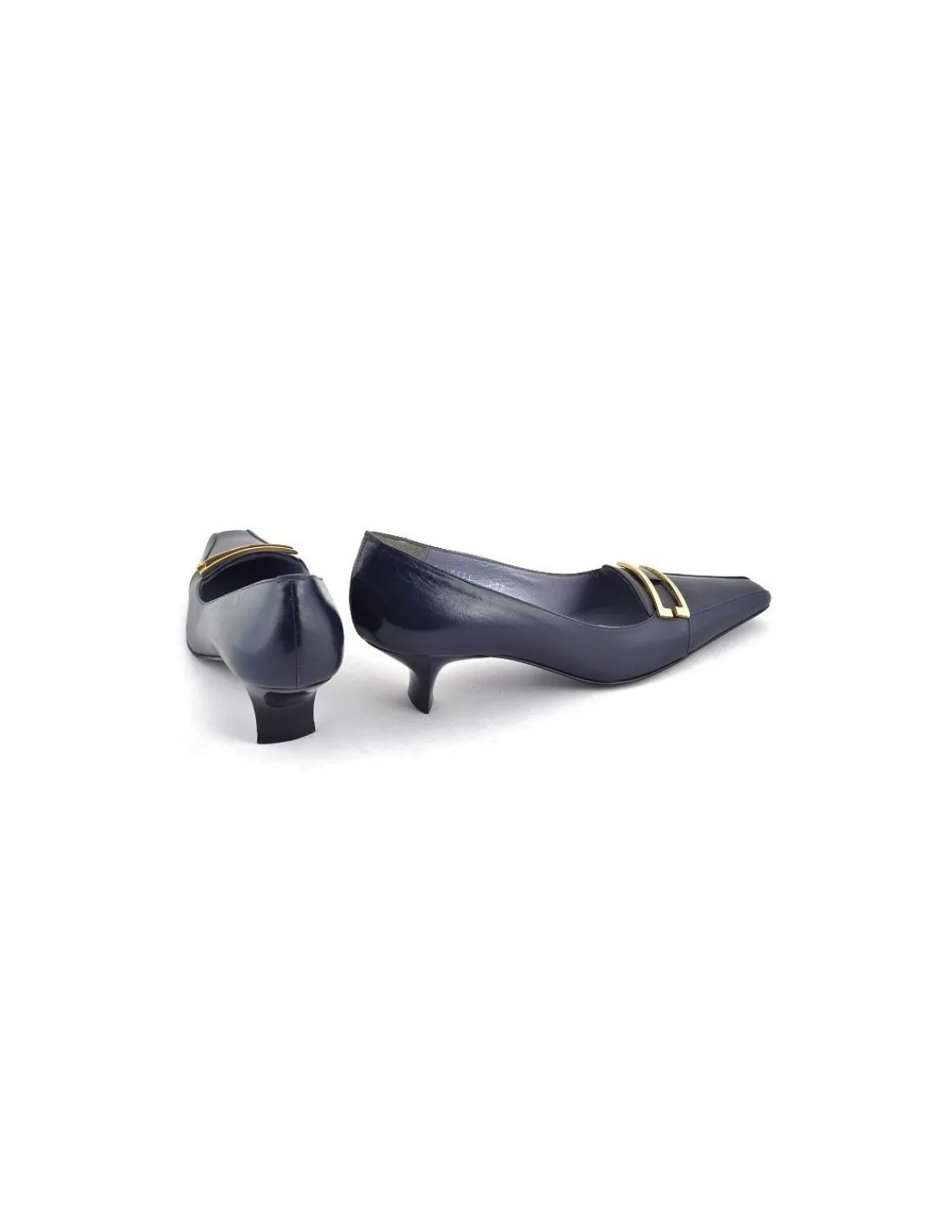 Luksusowe czółenka wykonane z licowej, miękkiej skóry w pięknym, głębokim, granatowym odcieniu. Przód zdobi efektowna klamra w złotym kolorze.