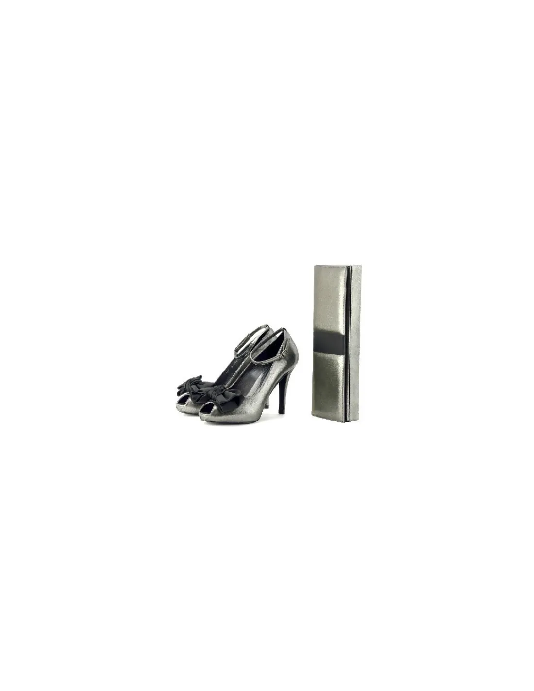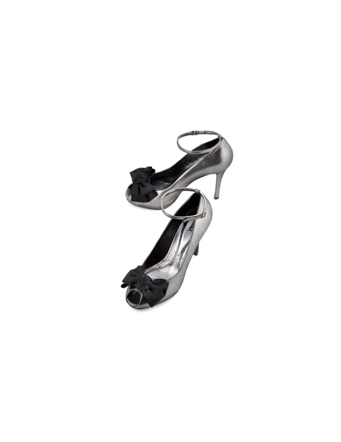 Szpilki wykonane są z najwyższej jakości, miękkiej skóry nubuk w kolorze starego srebra, ołowiany, metaliczny odcień . Forma okrągła z otwartym noskiem. Otwór na palce zwany „Peep Toe” jest bardzo dobrze zaprojektowany. Stopy bezpiecznie osadzone w szpilkach z widocznymi końcówkami palców prezentuje się zjawiskowo, kobieco i elegancko. Efektownym rozwiązaniem jest ozdoba w postaci dużej, kilkuwarstwowej kokardy z czarnej, jedwabnej wstążki. Wewnątrz futrówki oraz logowane wkładki wykonane są ze skóry licowej w srebrnym kolorze. Dodatkowo pod skórzaną wkładką umieszczono miękki silikonowy dodatek podnoszący komfort użytkowania.