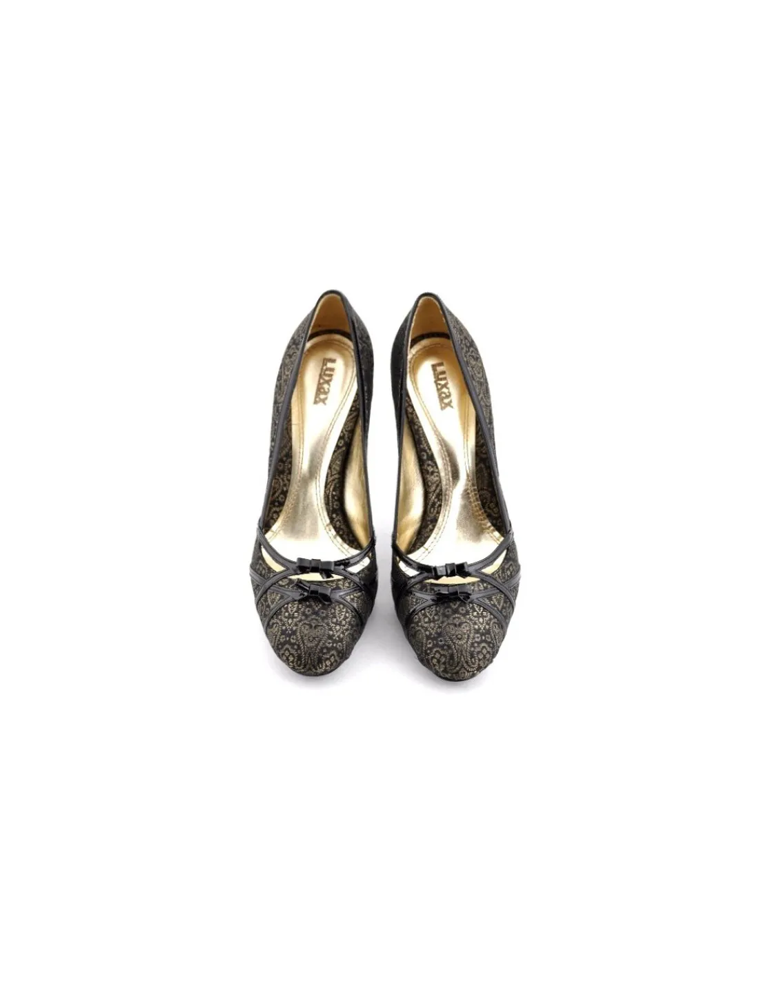 Czółenka wykonane są niezwykle efektownie z jedwabnego żakardu ze złotym haftem i wykończone czarną, lakierowaną skórą. Ta para została wykonana z najwyższej jakości, czarnej tkaniny – żakardu jedwabnego, przetykanego metaliczną nicią w kolorze złotym (NIE, nie jest to sukienkowa tkanina, zatem nie obawiajcie się o jej trwałość). Tkanina jest precyzyjnie dopasowana ze skórzanym wnętrzem czółenek, zabezpieczona i w całości dopracowana na najwyższym poziomie przez mistrzów sztuki szewskiej z LUXAX. Efektownym rozwiązaniem są cieniutkie paseczki zakończone malutkimi kokardkami z czarnej skóry lakierowanej, przeplatające się na przodach nieco powyżej nosków. Zdecydowanie nie przejdziesz w nich niezauważona, bowiem te szpilki przyciągają uwagę i spojrzenia!. Forma czółenek okrągła dość szeroka z noskami okrągłymi, podniesionymi. Wewnątrz futrówki i logowane wkładki z bardzo miękkiej naturalnej skóry licowej w kolorze złotym. Dodatkowo pod skórzaną wkładką dla komfortu użytkowania umieszczono miękki, silikonowy dodatek.