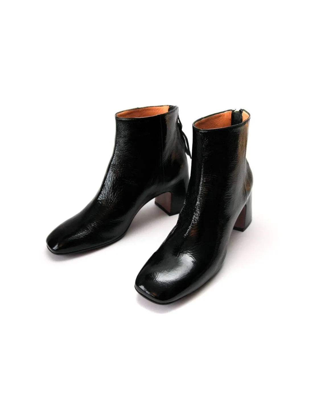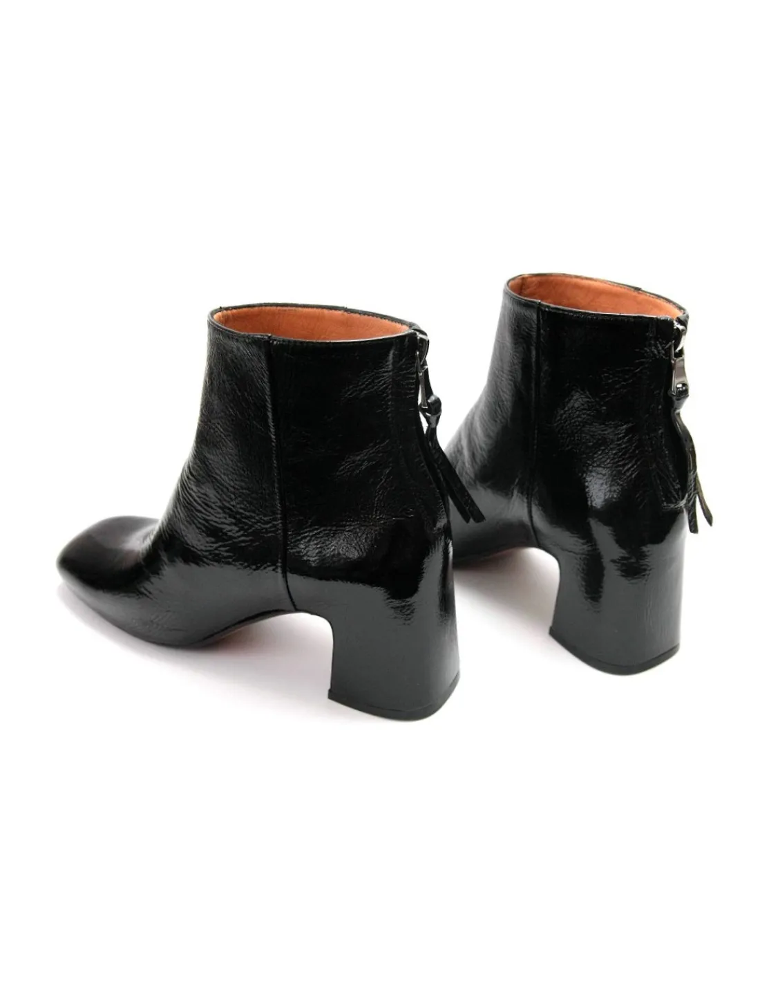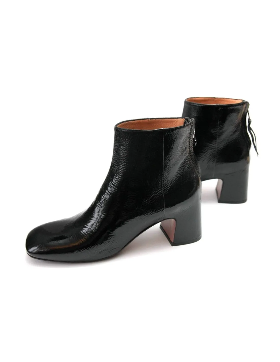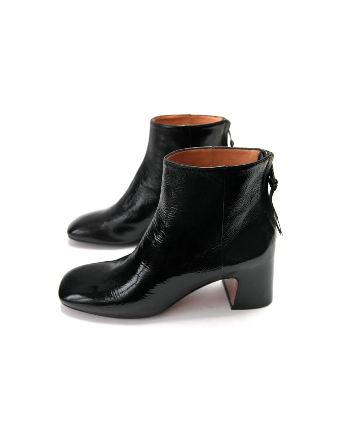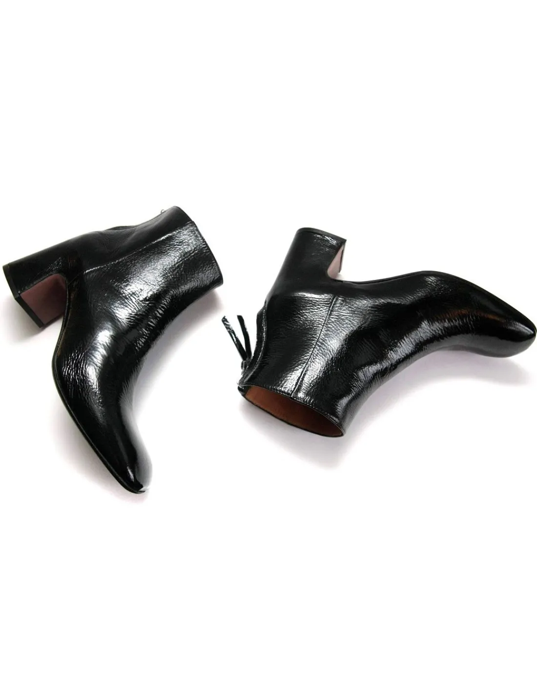 Wykonane ze skóry lakierowanej typu cracle (jest bardzo elastyczna, pomarszczona, ale po założeniu na stopy częściowo prostuje się) w klasycznej czerni.
